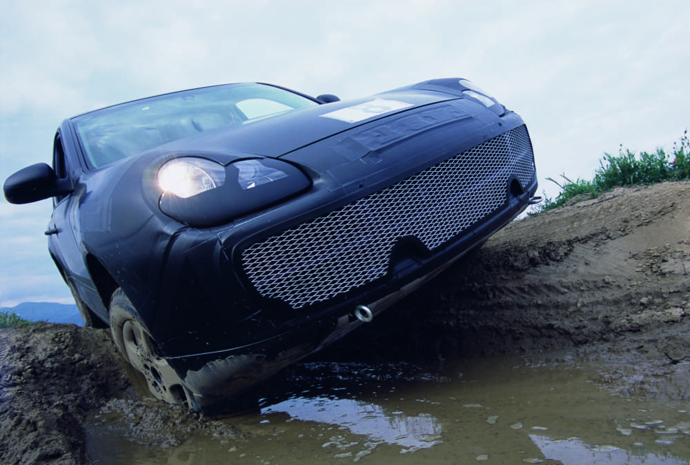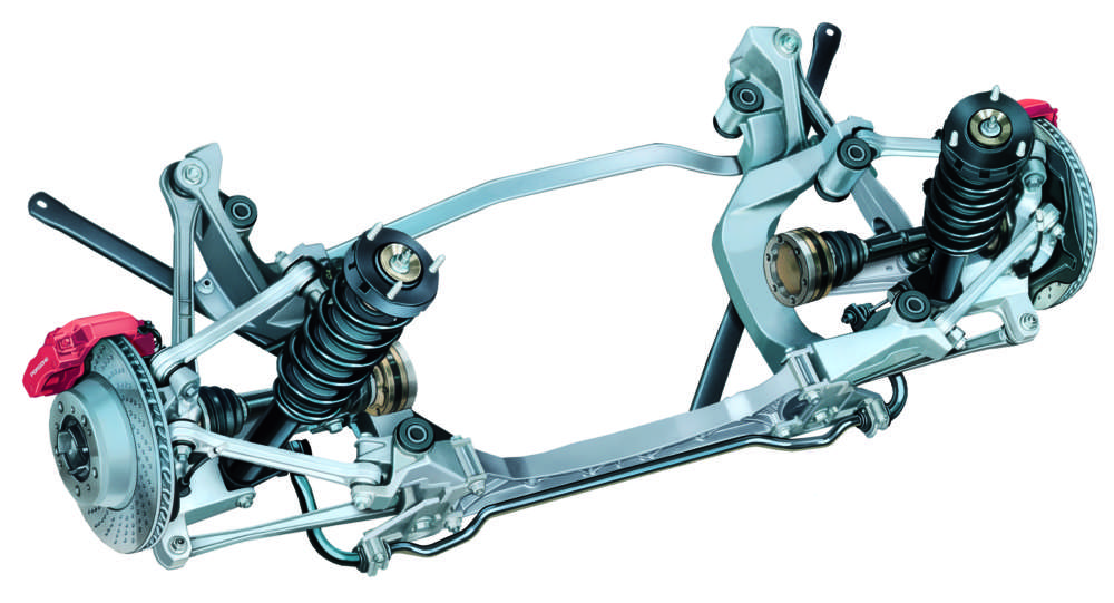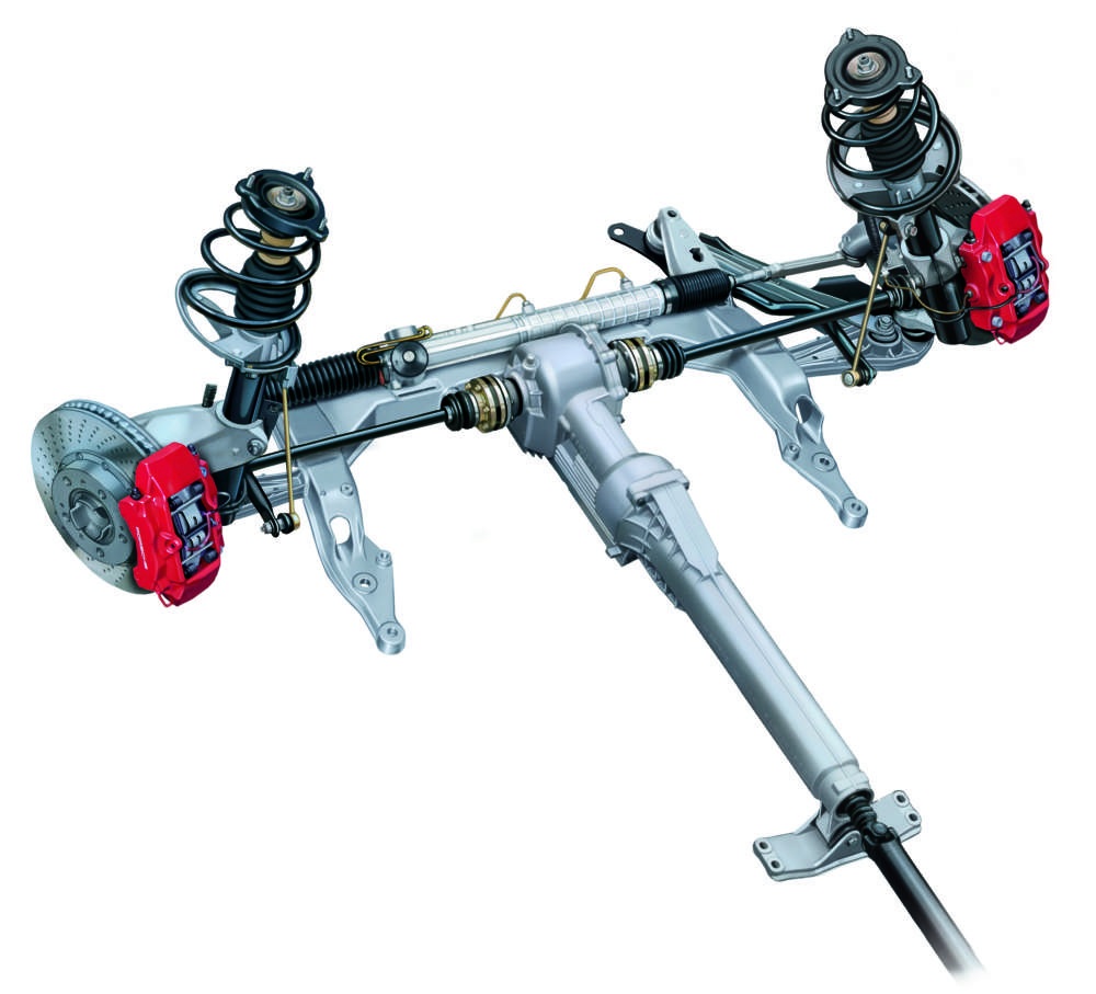 Front axle of the 911 Carrera 4S with multi-plate viscous coupling, drilled and ventilated brake discs (diameter 330 millimeters, width 34 millimeters) and red brake callipers