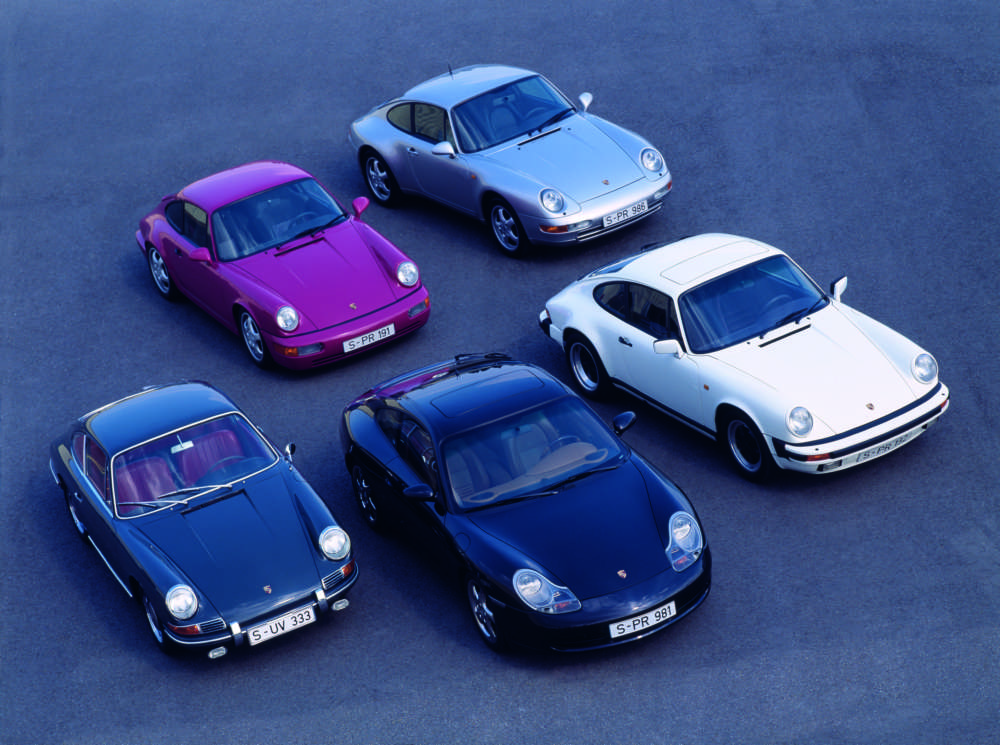 The Porsche 911 from 1963 (standing at an angle) and its âÂÂoffspringâ (from above): âÂÂGâ model, âÂÂ964âÂÂ, âÂÂ993â and the âÂÂ996â (internal designation).