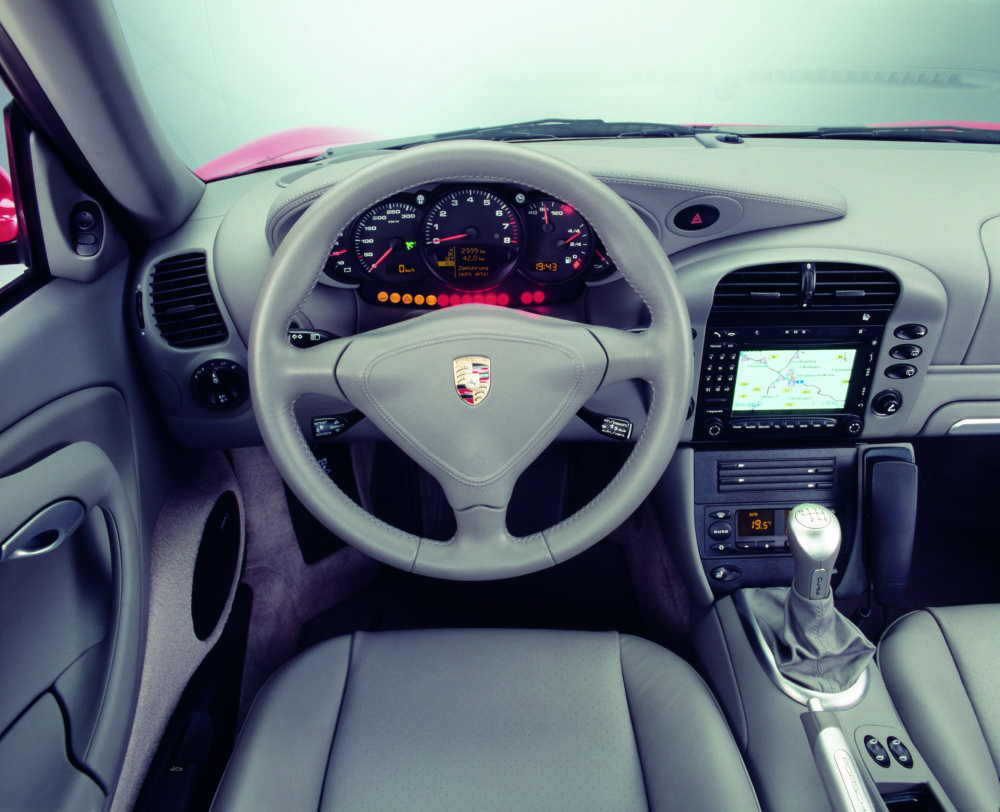 Interior equipment of the 911 Turbo with the three-spoke steering wheel, Porsche Communication Management (PCM) and a glove compartment