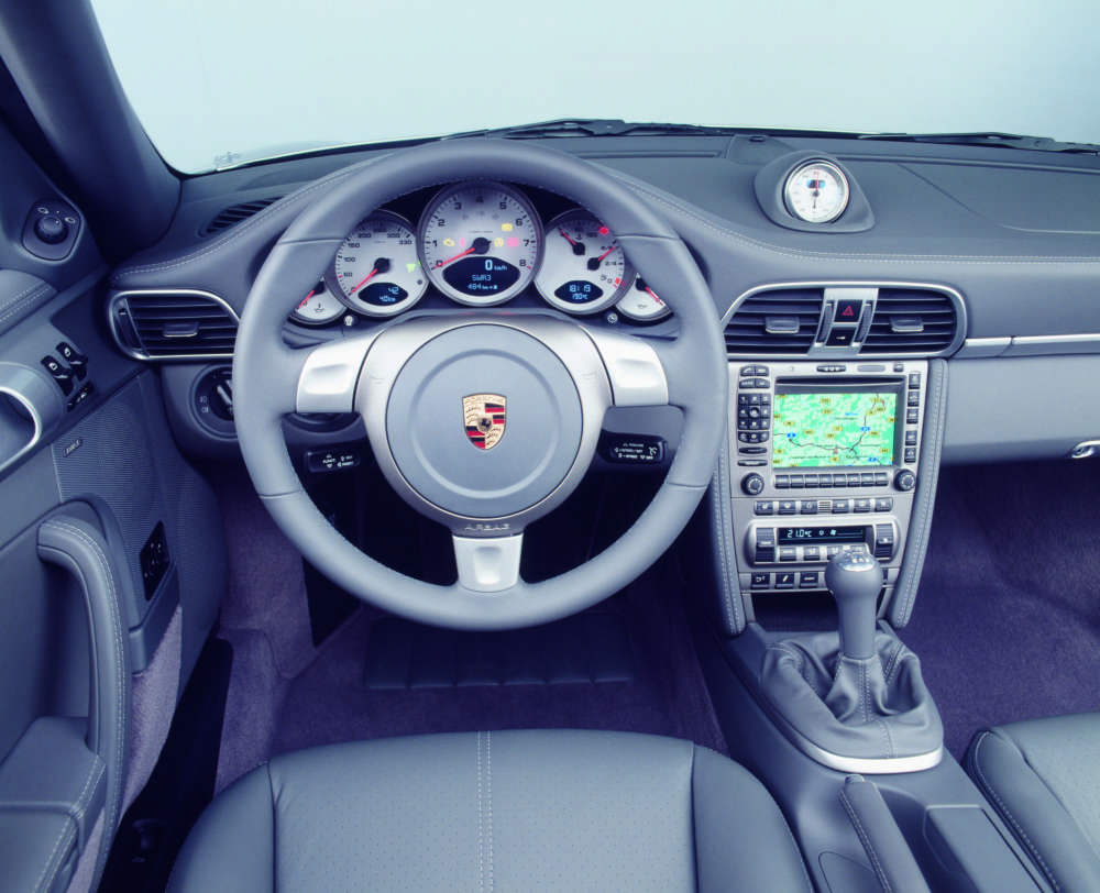 Interior fittings of the 911 Carrera Cabriolet with Tiptronic S transmission system, multi-functional steering wheel and Porsche Communication Management (PCM) with navigation module