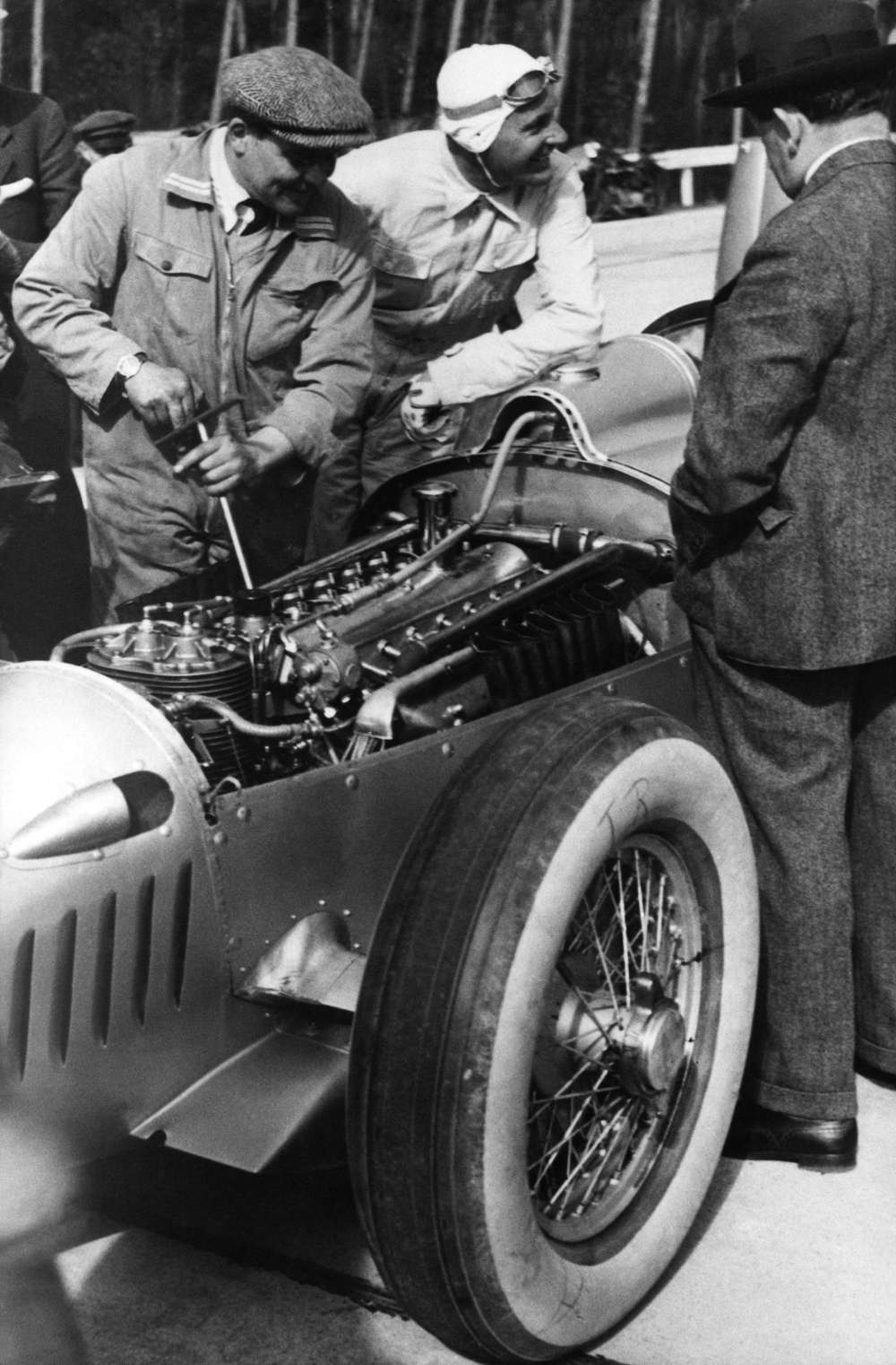 Ferdinand Porsche and racing driver Hans Stuck at the test drives for the Auto Union racing car (Porsche Type 22) with 16-cylinder mid-engine in use since 1934