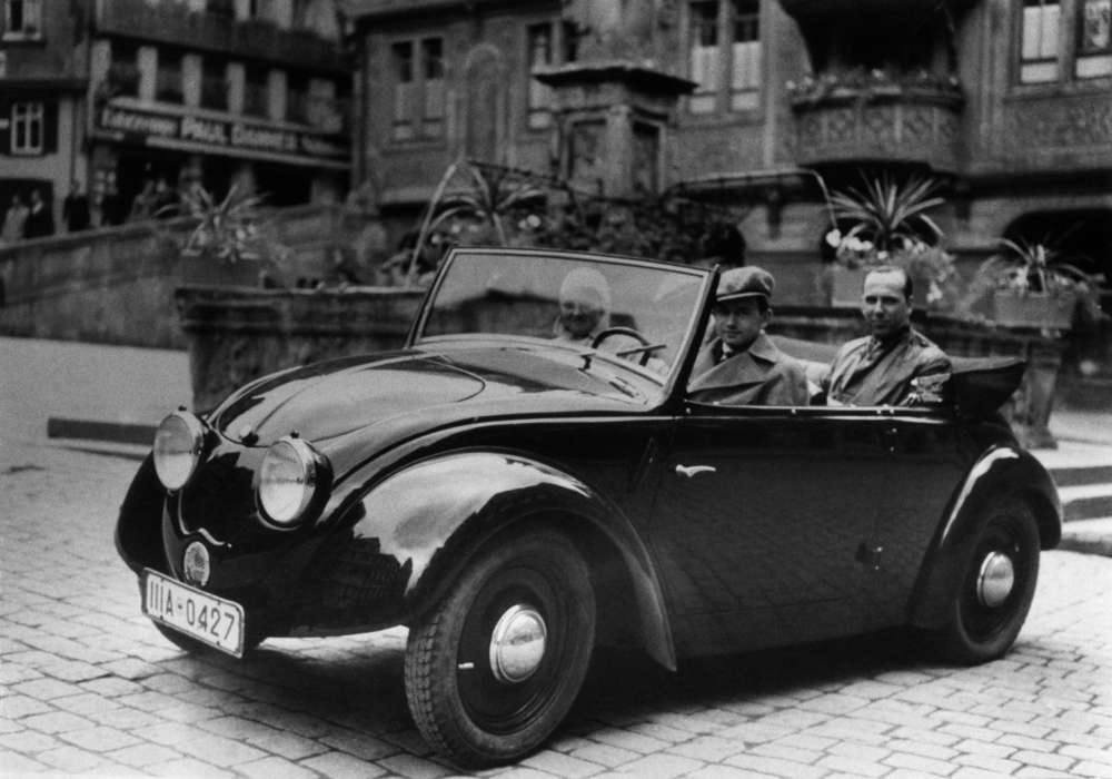 The Porsche Engineering Office develops a trend-setting small automobile with model number 12 for Zündapp GmbH. Standing beside the vehicle: Ferry Porsche