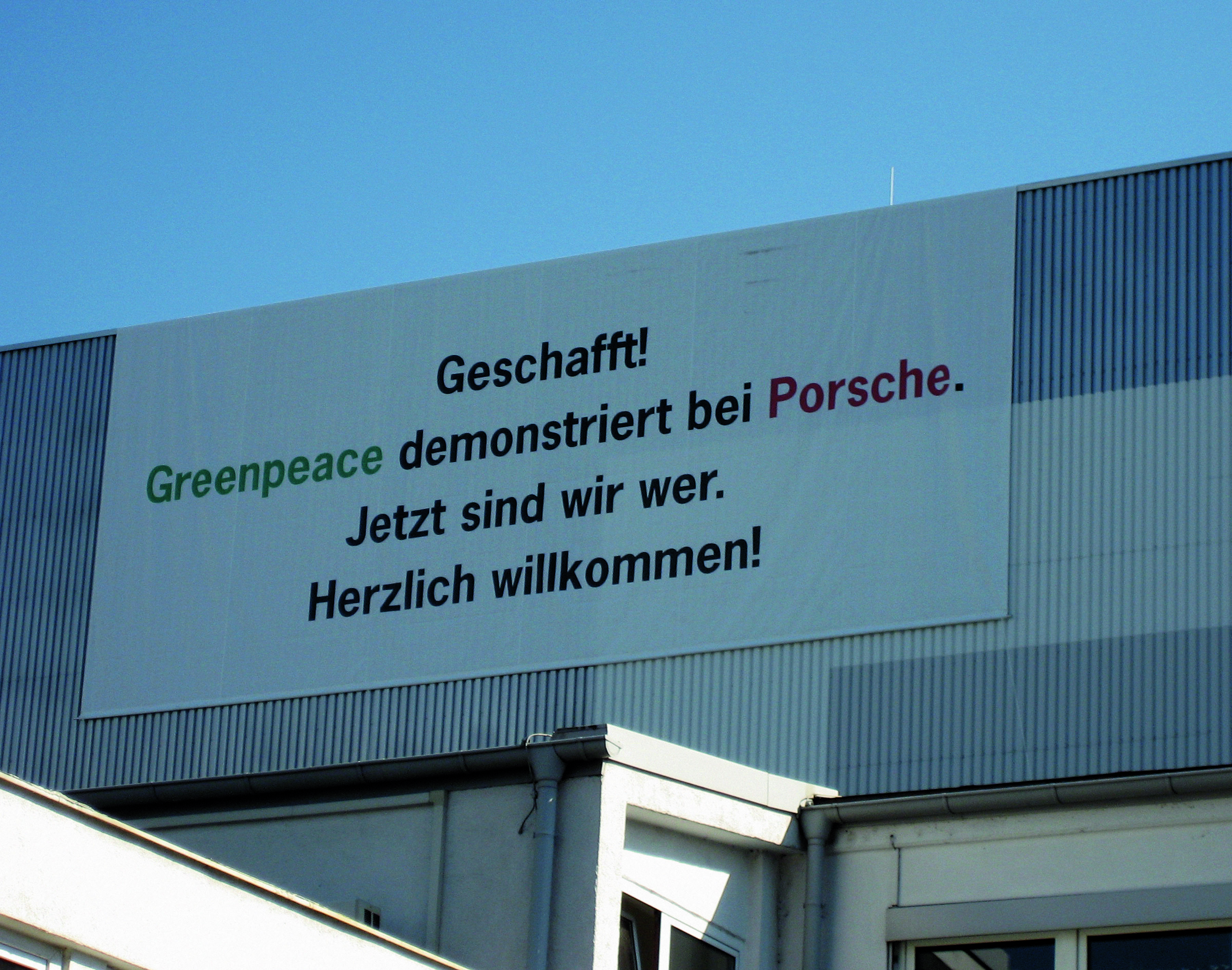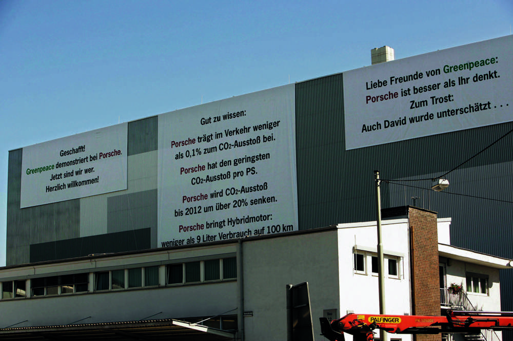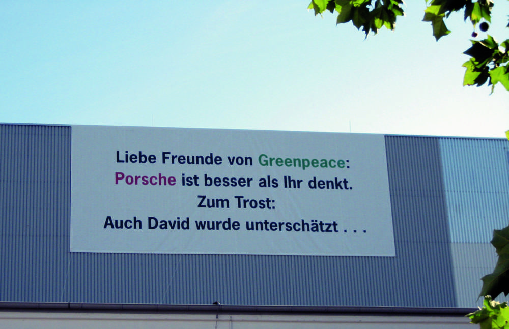 Porsche posters on the occasion of the Greenpeace demonstration at Porsche's headquarter in Stuttgart-Zuffenhausen