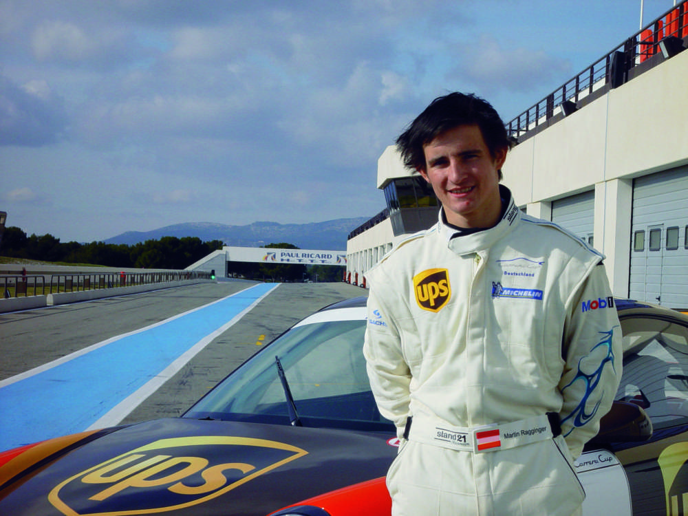 The new UPS-Porsche-Junior: Martin Ragginger in front of the Porsche GT3 Cup