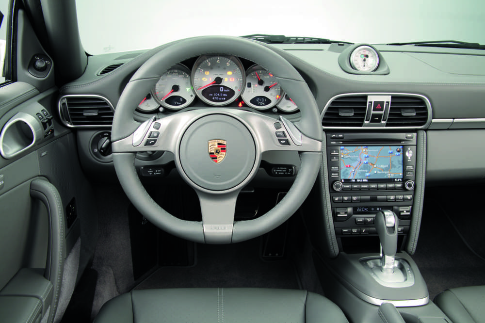 Cockpit of the 911 Carrera 4S Cabriolet, with, among other things, the Porsche PDK sports steering wheel, Sport Chrono Package Plus, and BOSE Surround Sound System