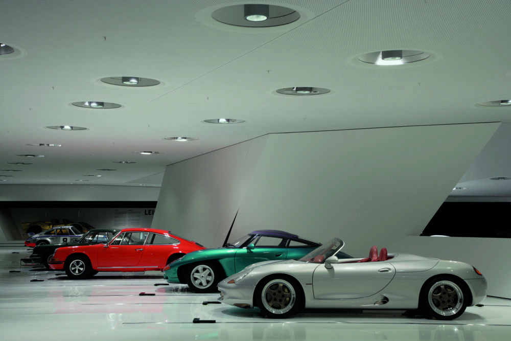 The exhibition: The Idea âfastâ shows the Porsche 956 spectacular arranged above the visitorâs head from the ceiling of the Museum