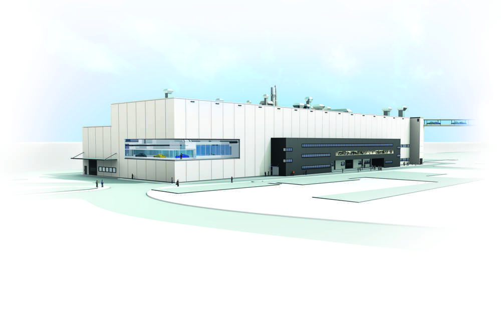 The new paint shop at Porsche AG in Stuttgart-Zuffenhausen: the system does without the otherwise obligatory 60-metre-high exhaust air collecting stack.