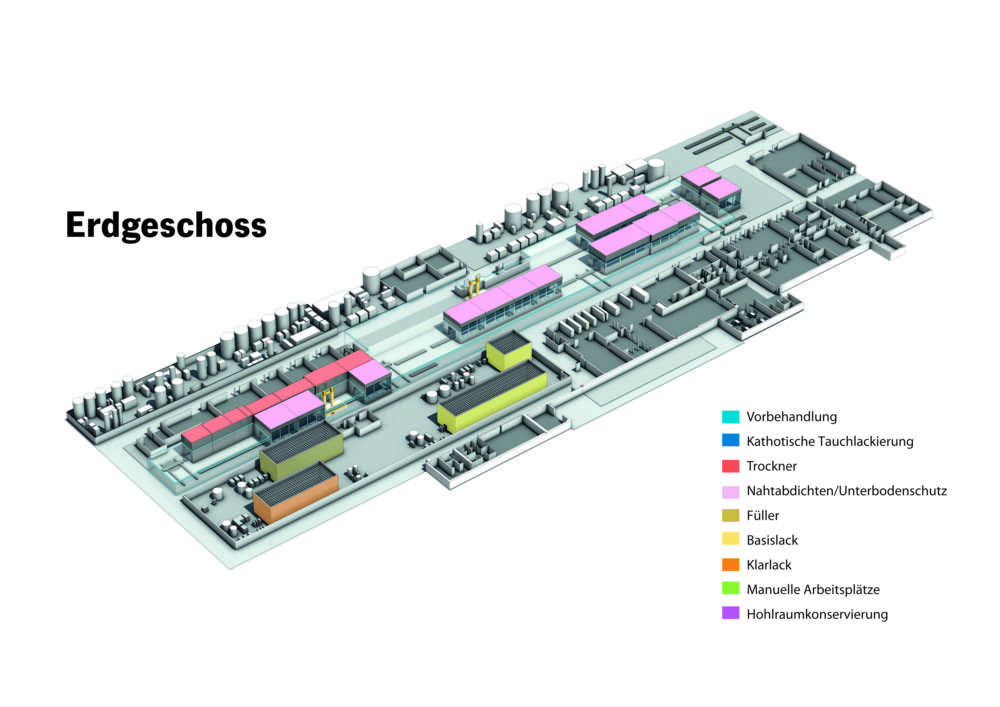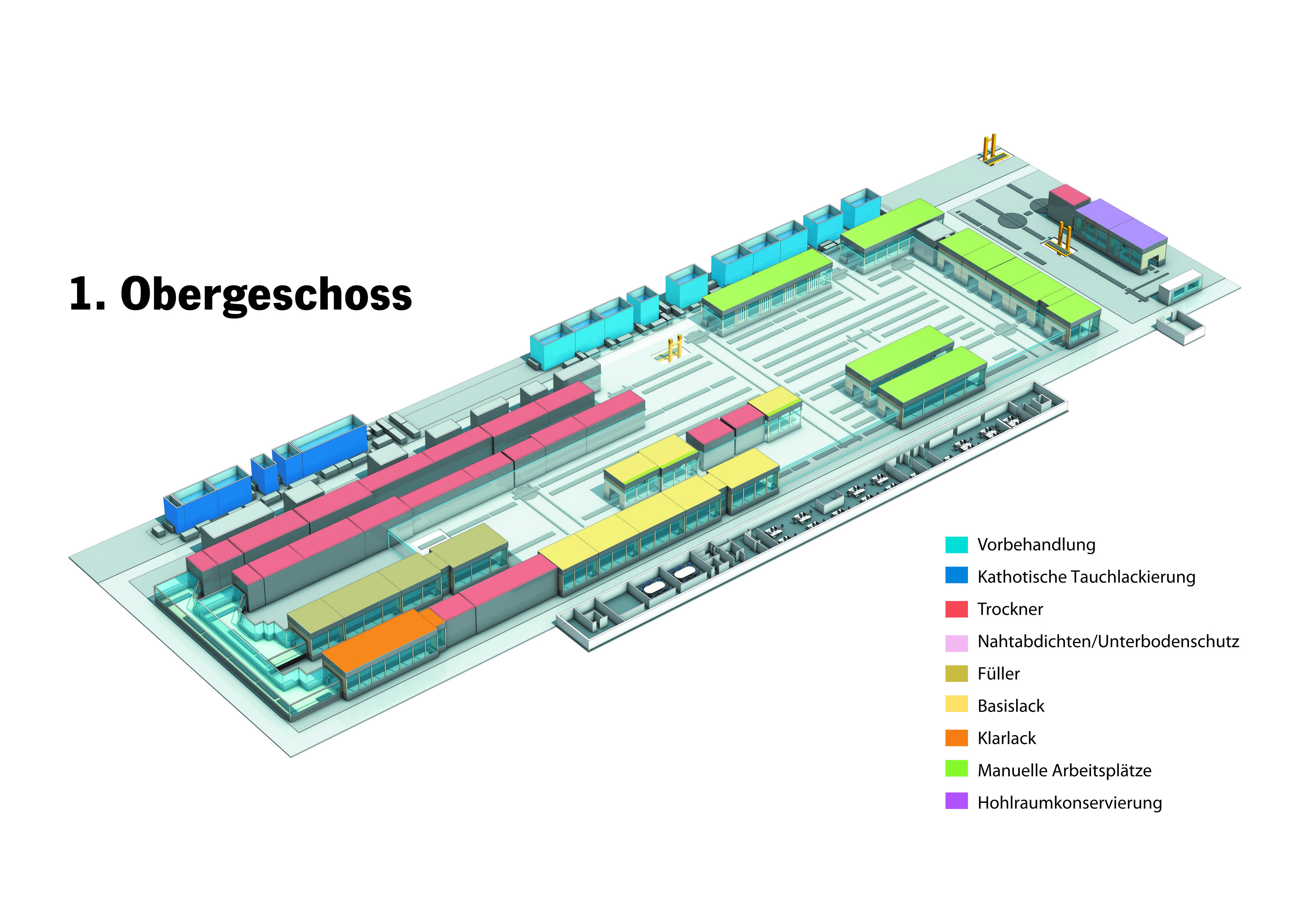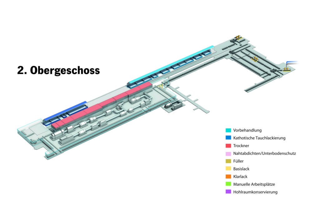 Pre-treatment and cathodic dip coating are carried out on the 2nd floor of the new paint shop.