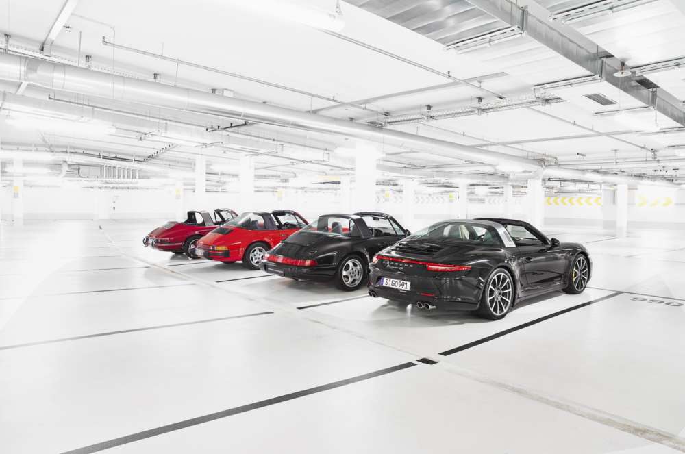Bar gallery: A brilliant display of evolution in the underground garage of the Porsche Museum in Stuttgart-Zuffenhausen - the 911 Targa 2.0, 911 SC Targa, 911 Carrera 2 Targa, and 911 Targa 4S.