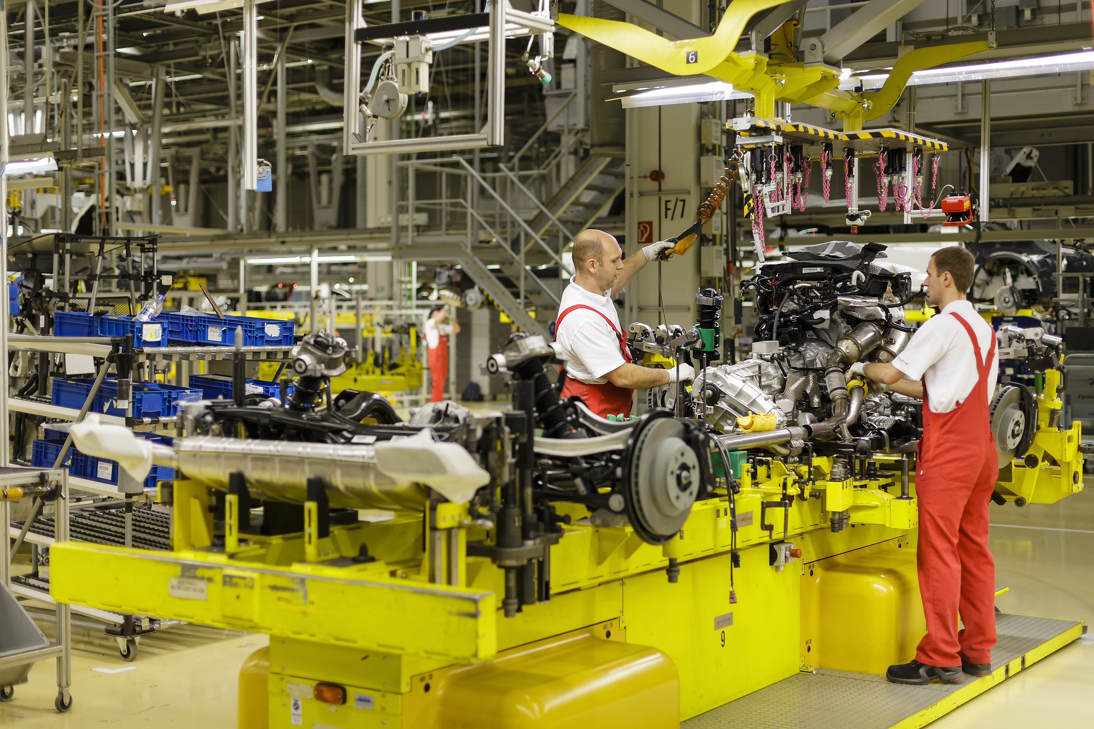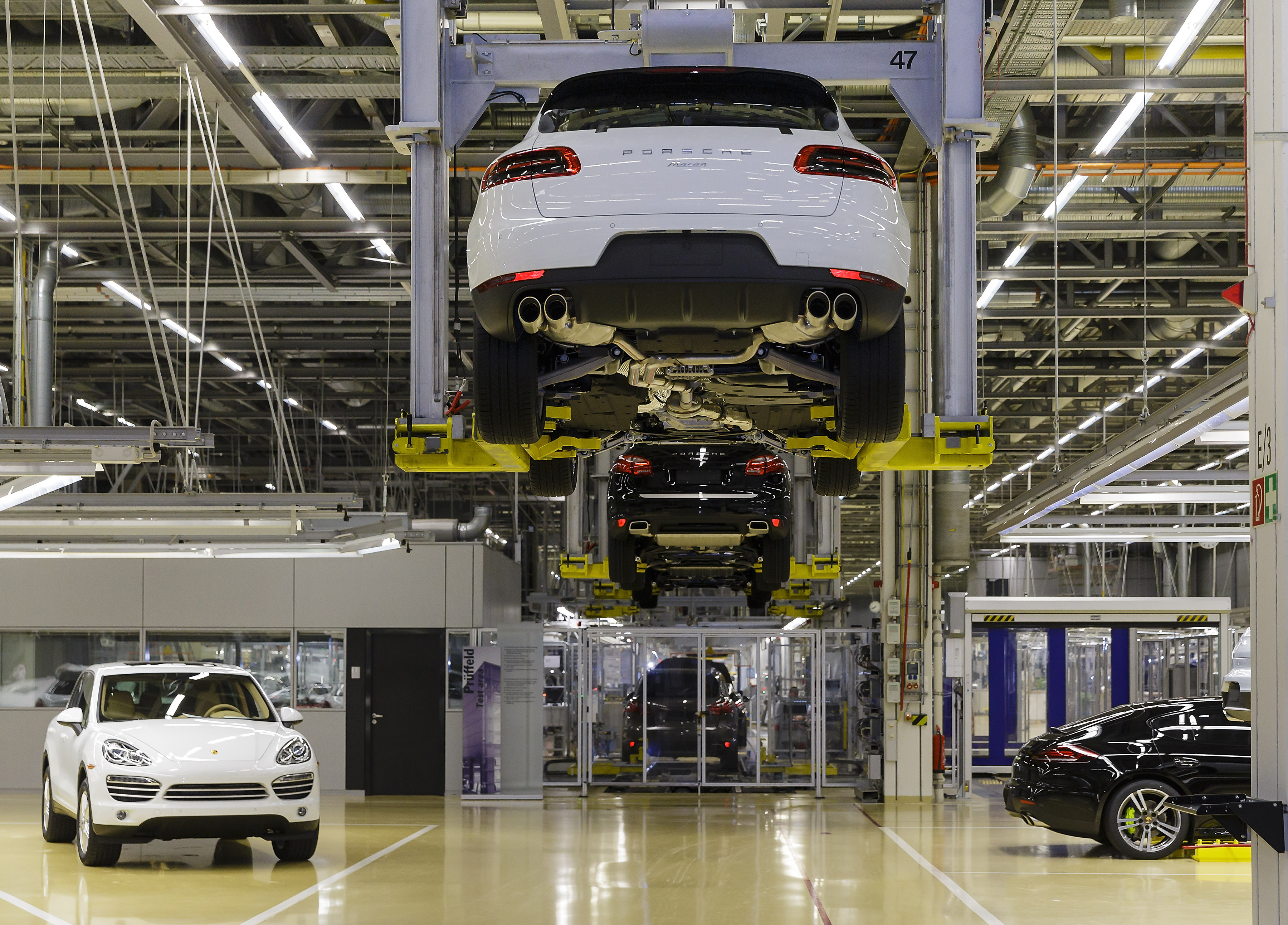 Three models "Made in Leipzig": Cayenne (left), Macan (middle) and Panamera (right)