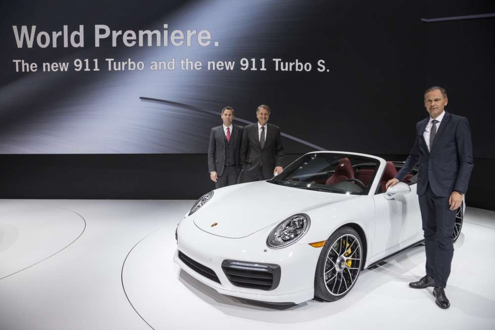 Porsche at the Detroit NAIAS 2016: F. l. to r. Dr. Oliver Blume, Chairman of the Executive Board of Porsche AG, Detlev von Platen Member of the Exective Board Sales and Marketing of Porsche AG, Klaus Zellmer President and CEO of Porsche Cars North America present the new Porsche 911 Turbo S