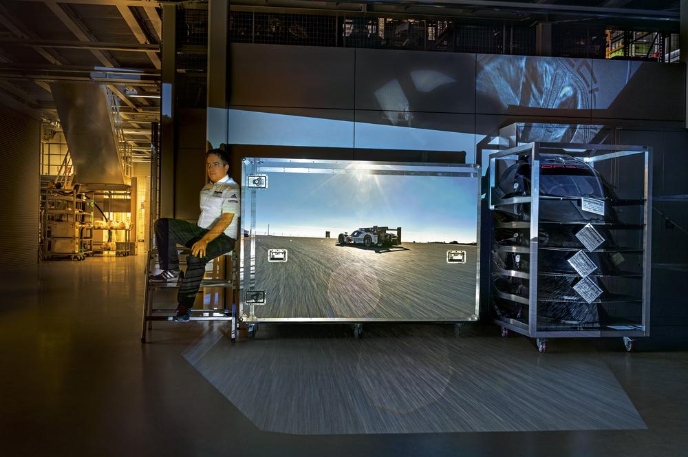 Steven Mitas (Head recing engineer) in front of a projection of the 919 Hybrid (2016)