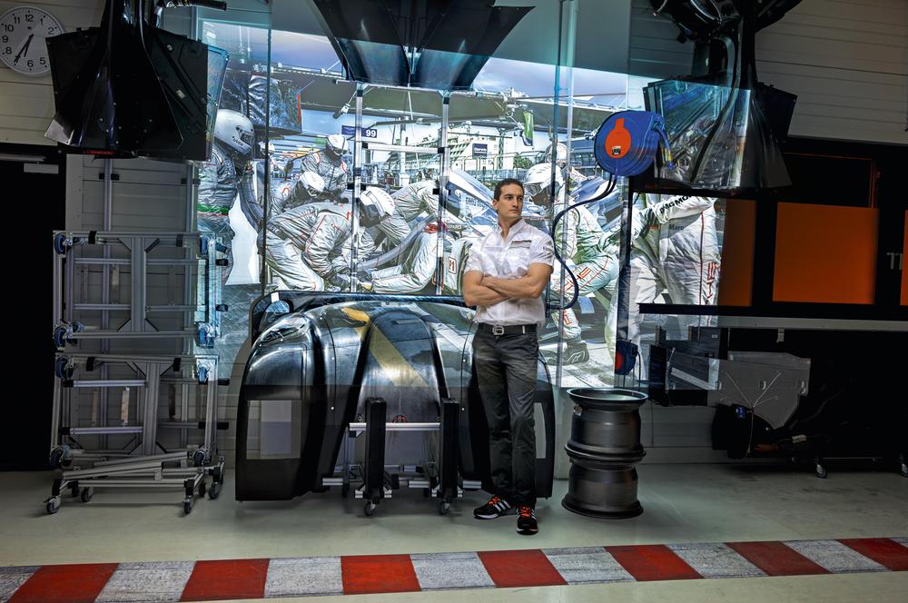 Pascal zu Linden (Strategy engineer) next to a projection of the 919 Hybrid (2016)