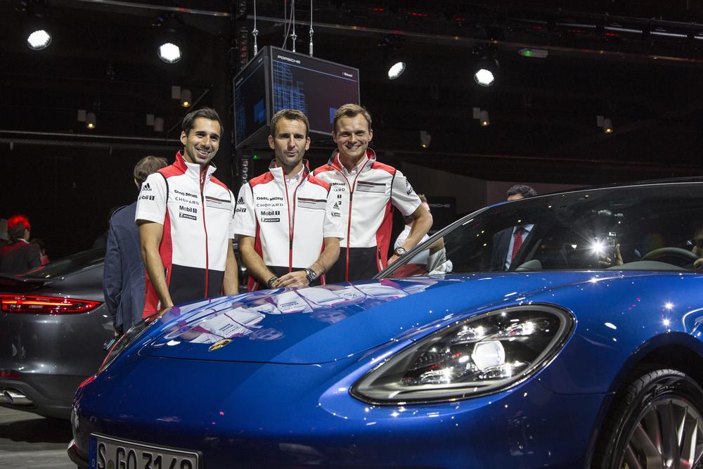 World premiere of the new Porsche Panamera 2016 in Berlin: (left to right) Porsche works driver Neel Jani, Romain Dumas and Marc Lieb