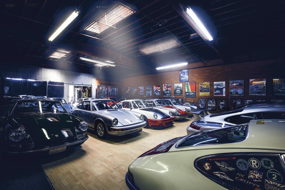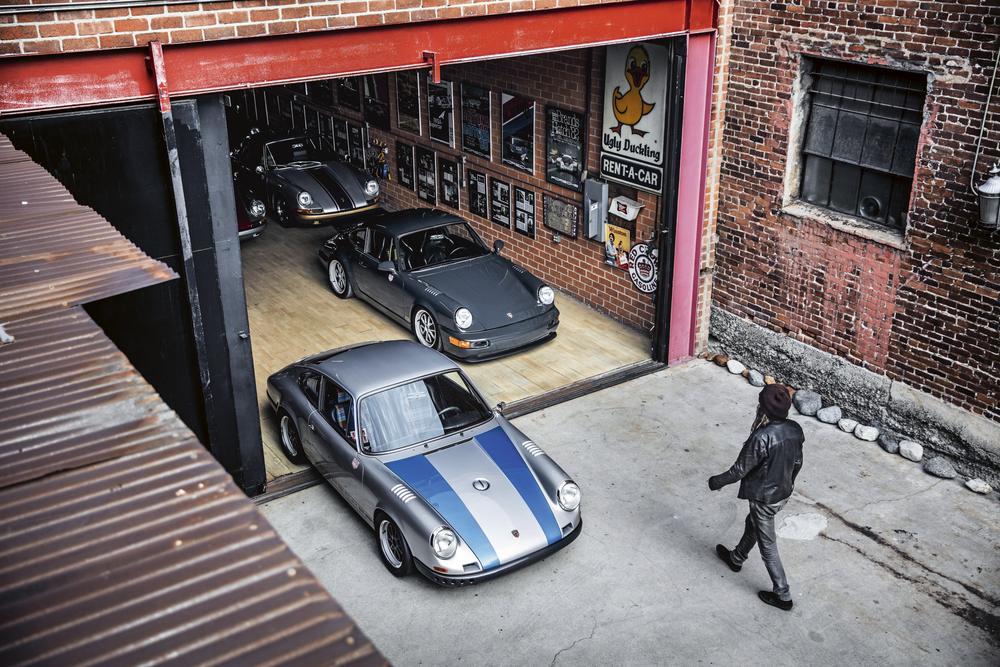 Magnus Walker’s Porsche 911s in a warehouse in downtown Los Angeles