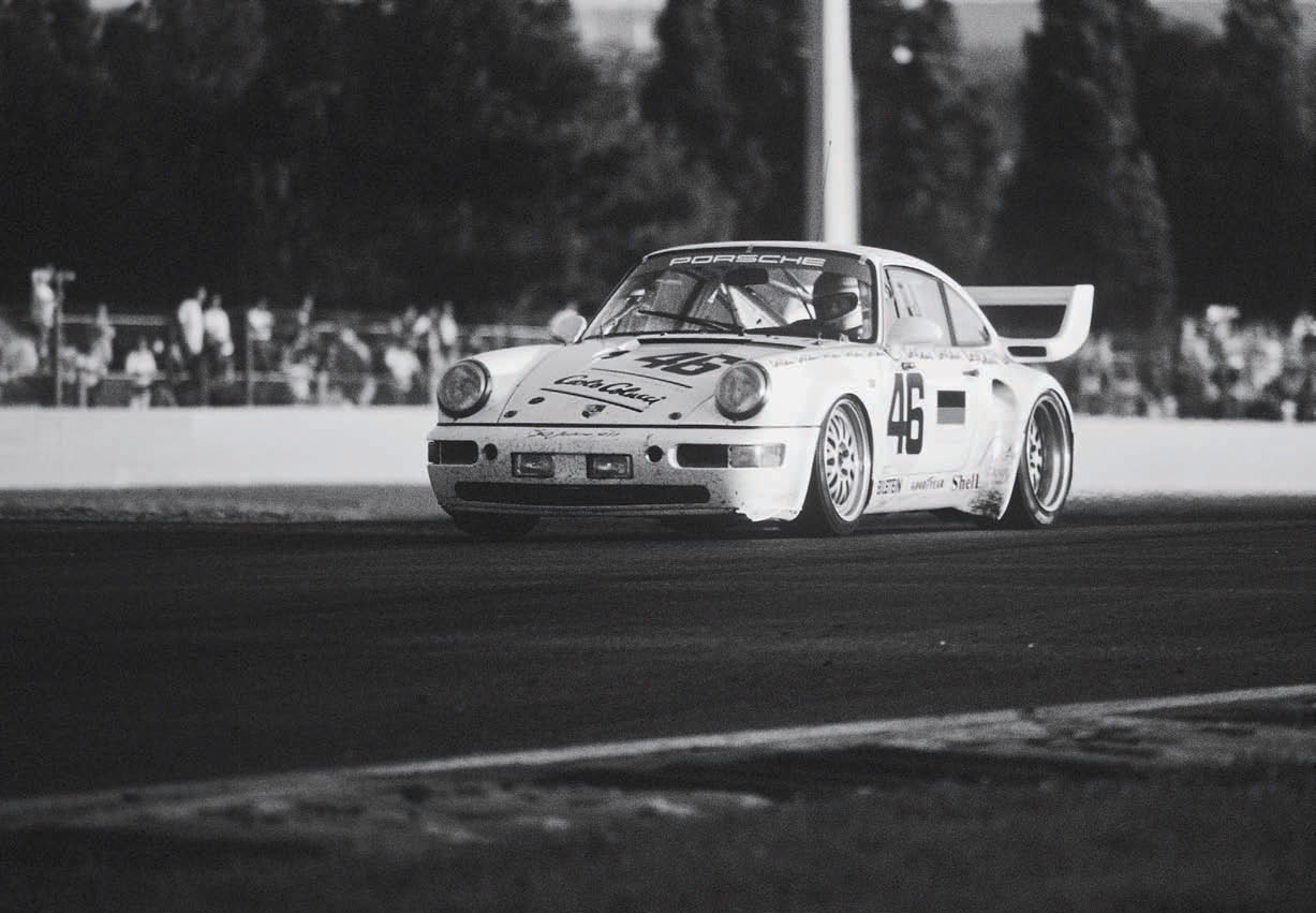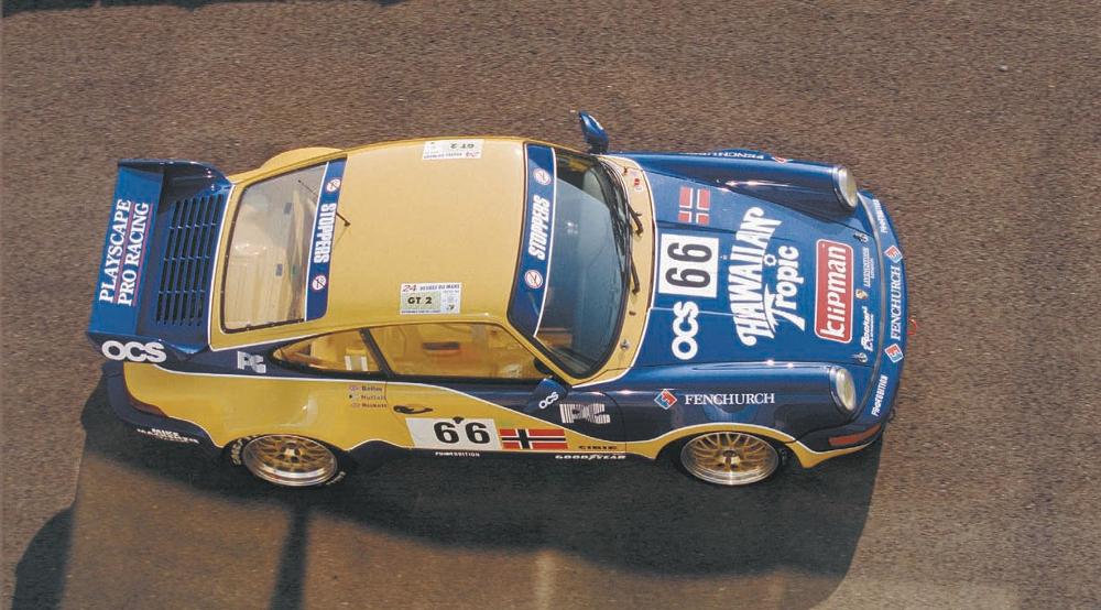 The 1994 Carrera RSR3.8 entered the pits at Le Mans. Raymond Bellm, Harry Nuttall, and Charlie Rickett started 25th on the grid in GT2 class but a mechanical failure retired them after just 32 laps. Porsche Archiv