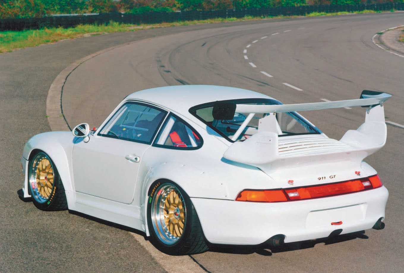The meanest and leanest of the 993s came in the GT2 model, a vehicle with little pretention and clear ambition for the winner’s circle. Where the standard C2 coupe weighed 3,014 pounds with 285 horsepower for 1996, and the RS Club Sport came in at 2,794 pounds and 300 horsepower (and sold for 164,700 DM—$109,800 at the factory but unavailable to U.S. buyers), the GT2 put 430 horsepower into the same weight (for 278,875 DM—$185,917.) As only 172 of these cars emerged from Weissach’s shops, it was clear, with their plastic wheel arch flares, aluminum doors, and massive three-piece Centerline 9x18 and 11x18 composite wheels, that the GT2 was not intended for mass consumption.