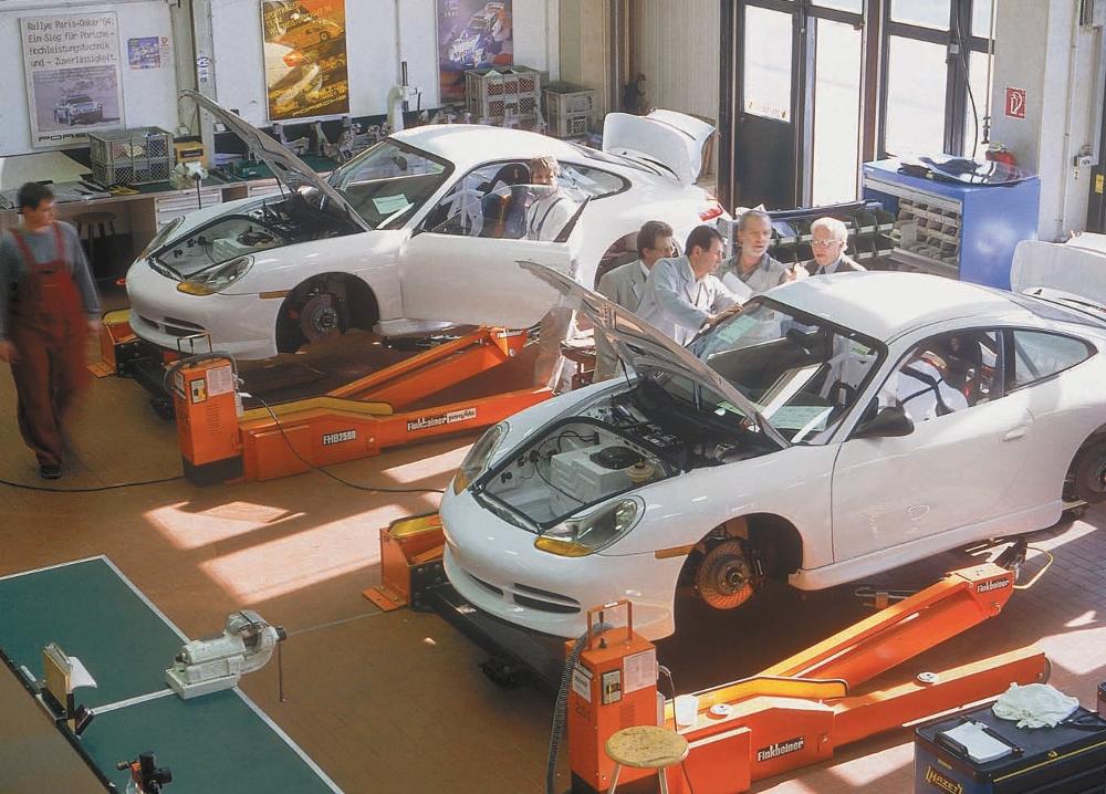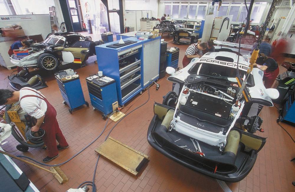 In the race shops at Weissach, mechanics and engineers assembled the customer racing 1997 GT1 models. Engines in these cars developed in excess of 600 horsepower for an automobile weighing just 2,310 pounds. Porsche Archiv