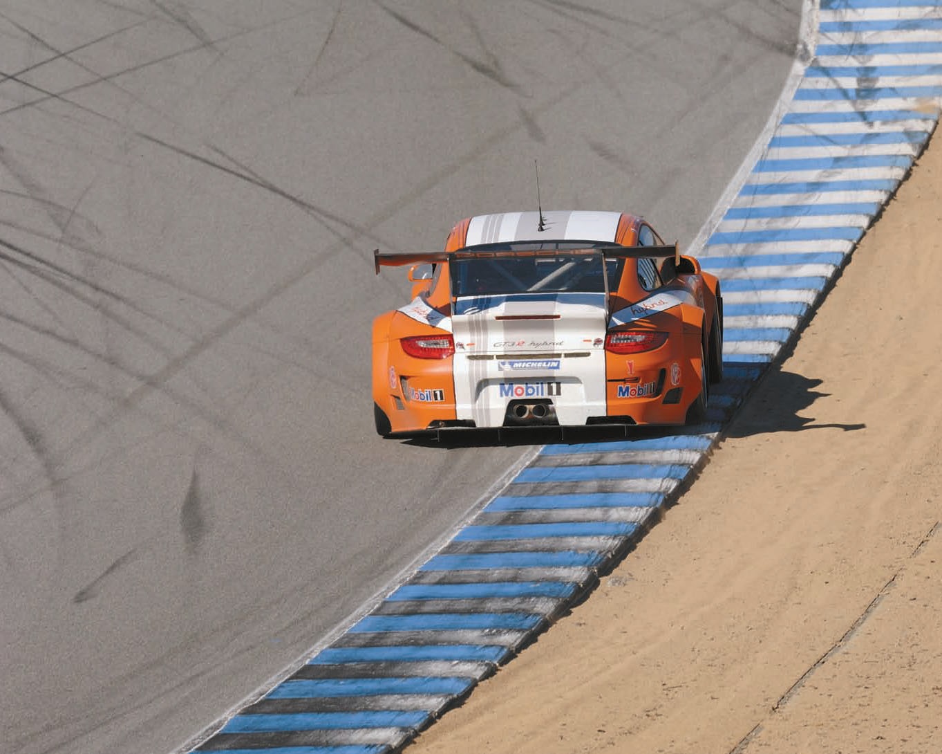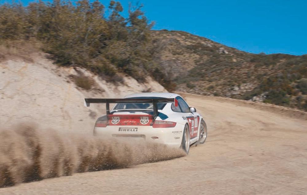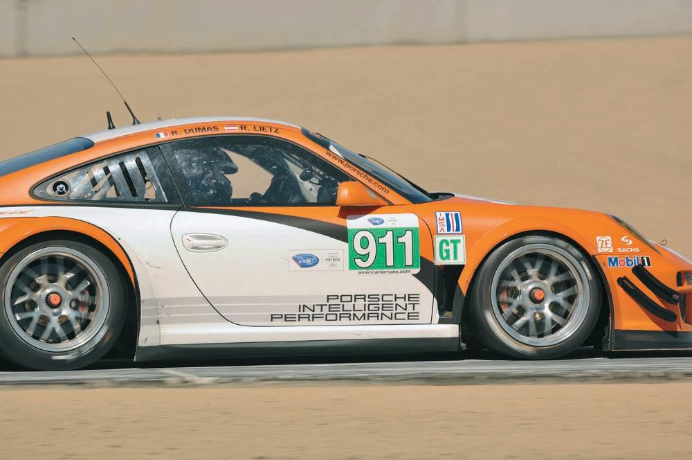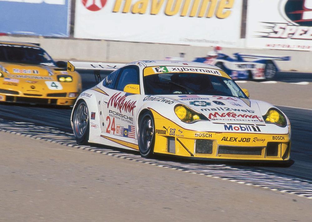 Accelerating out of Laguna Seca’s hairpin turn number 11 during the 2004 ALMS race, Mark Leib and Romain Dumas exchanged duties holding off Corvettes, Ferraris, and Aston Martins. Leib/Dumas won GT class in their GT3 RSR, finishing eighth overall. Porsche Archiv