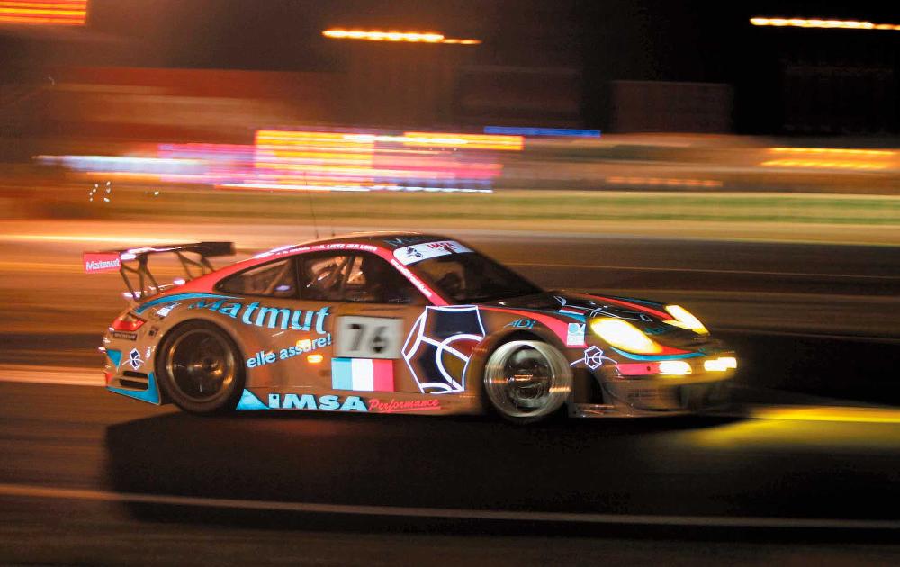 Patrick Long, Richard Lietz, and Raymond Narac raced at Le Mans in 2008, driving their day-glow painted GT3 RSR. They retired after an accident in the night. Porsche Archiv