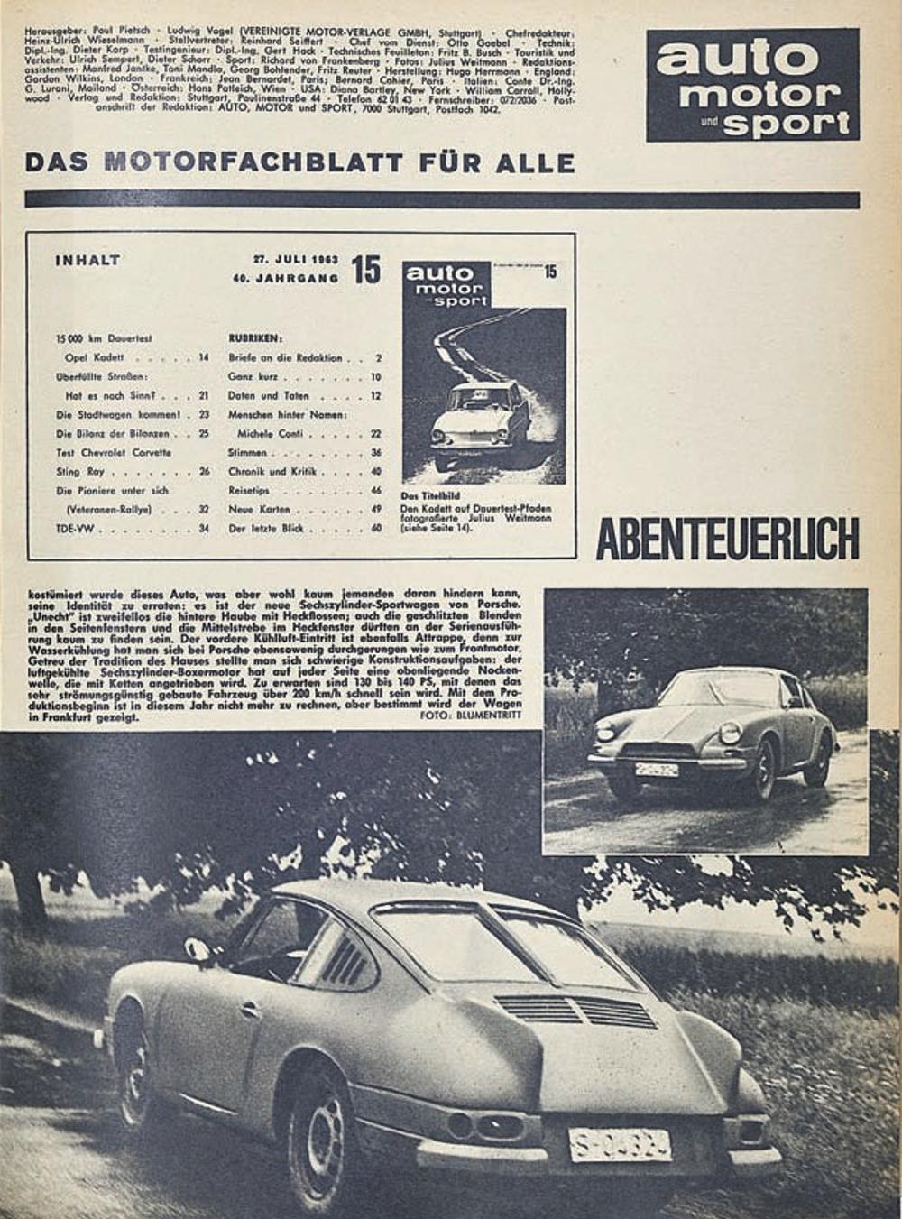 Its contents page headlines often were as exciting as anything else inside Auto Motor und Sport. The July 27, 1963, issue taunted its readers with the word “Adventurous,” and photos of the camouflaged and winged 901 prototype nicknamed der Fledermaus, the bat. Porsche Archiv