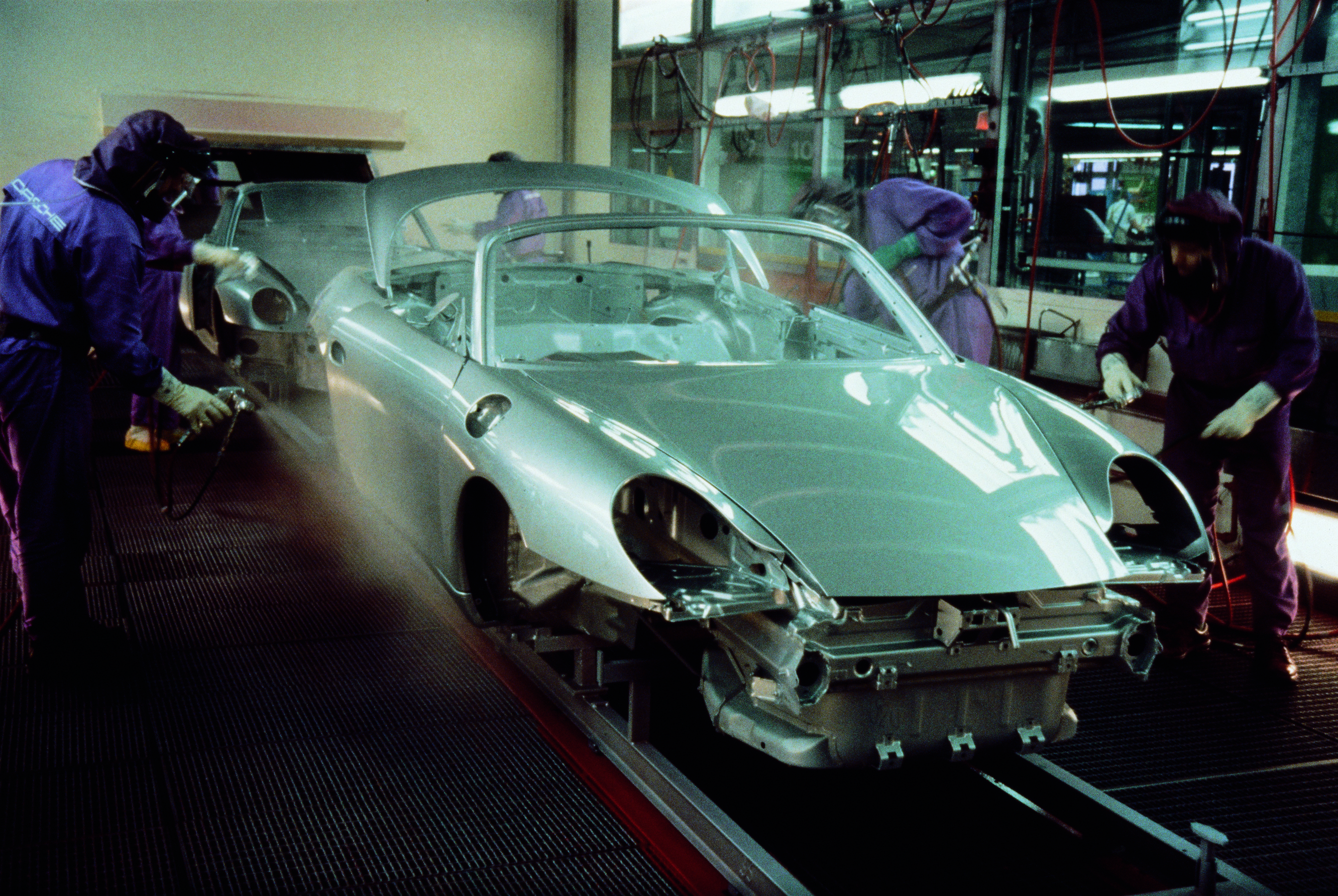 In the last stage of the painting process, a Boxster is given a coat of clear lacquer