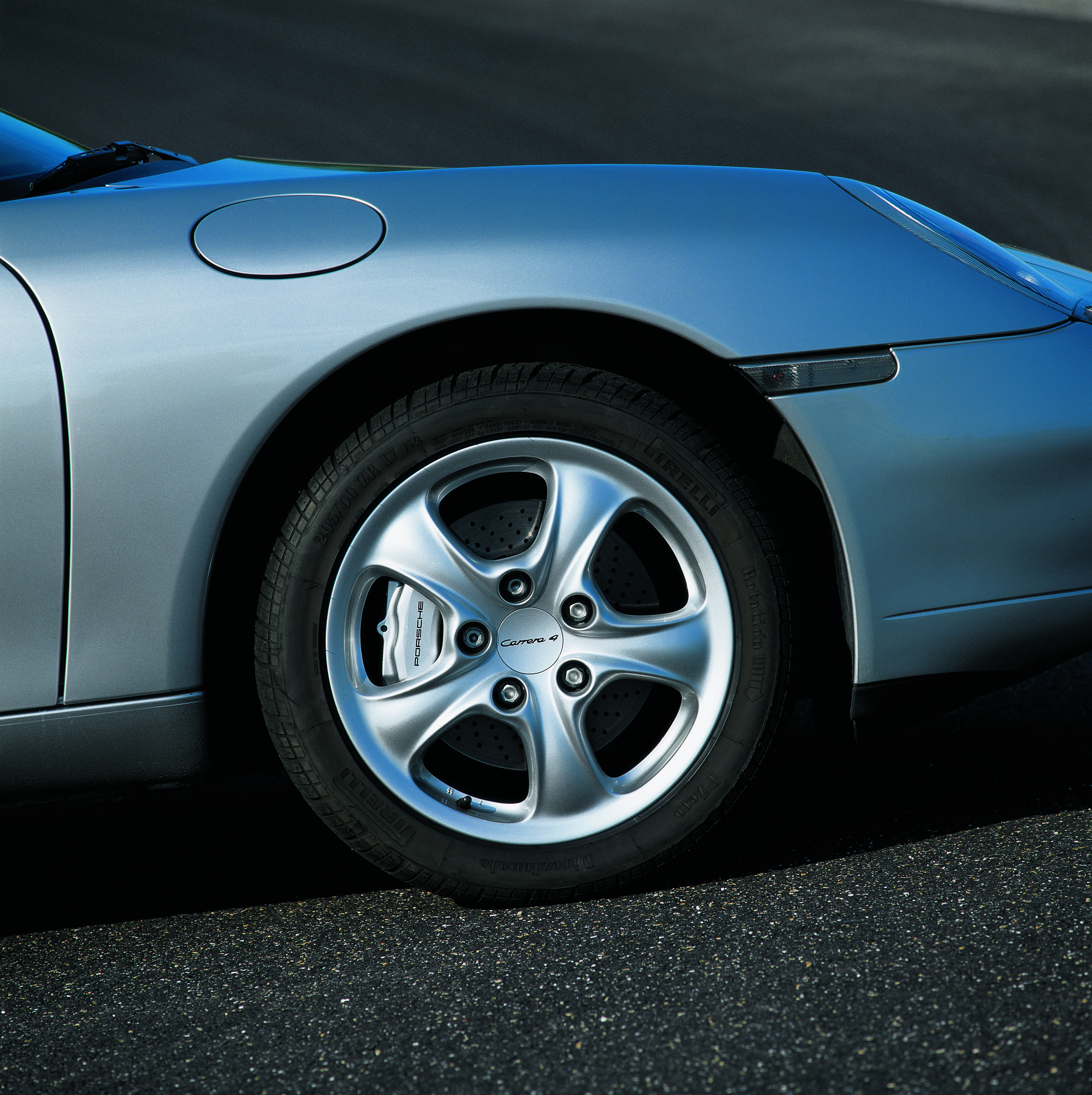 The 17-inch light alloy wheels were specifically designed for the Carrera 4. The brake calipers gleam in a titanium colour