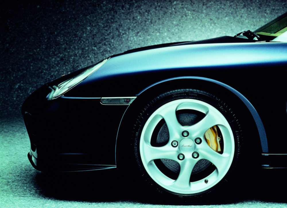 911 Turbo with Porsche Ceramic Composite Brake (PCCB) and brake caliper with yellow paint finish