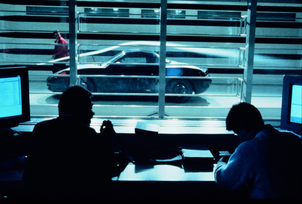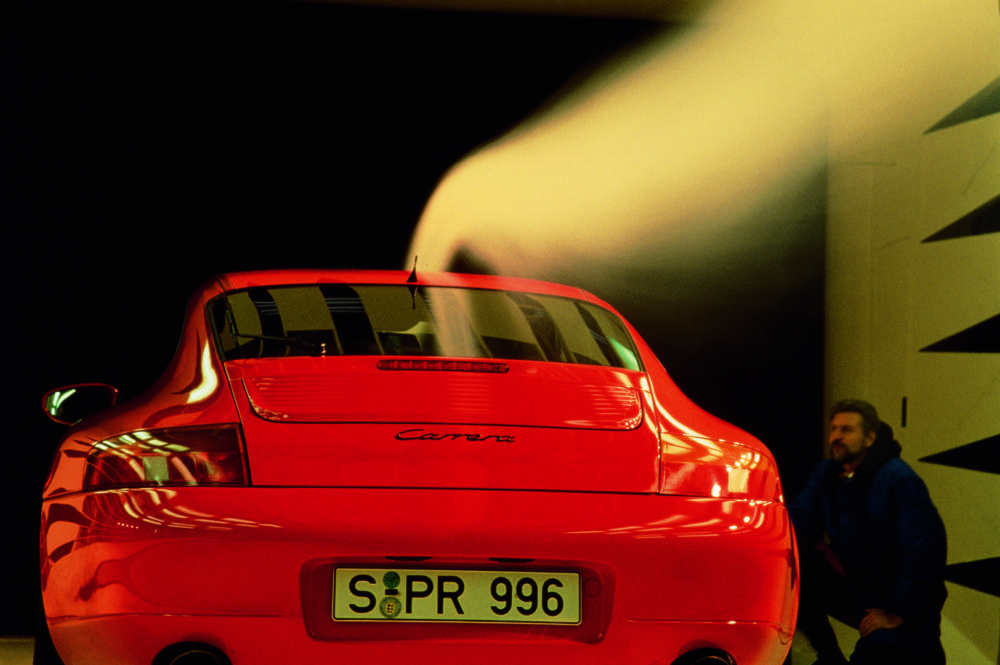 Engineers optimise the aerodynamics of the Porsche sports car in the wind tunnel