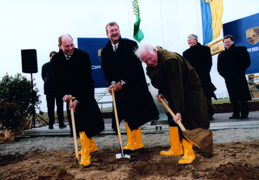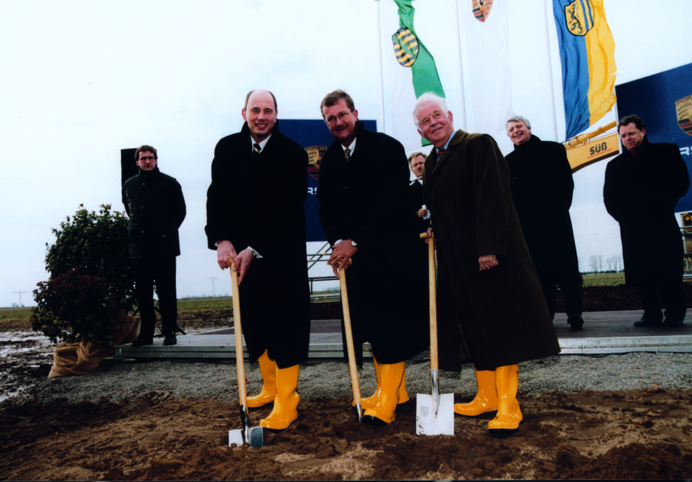 Ground-breaking ceremony on 7th February 2000 (from l. to r.): Mayor of Leipzig Mr. Wolfgang Tiefensee, Chairman of the Board Dr. Wendelin Wiedeking and State Head of Saxony Professor Kurt Biedenkopf