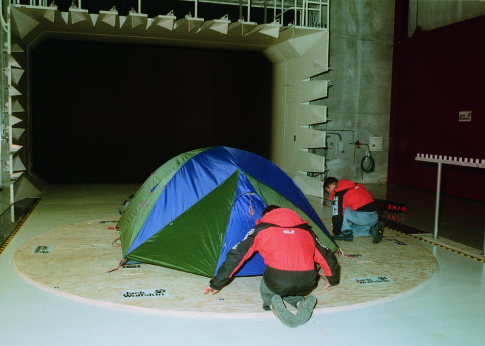 Checking the storm resistance of a Jack wolfskin tent in the wind tunnel