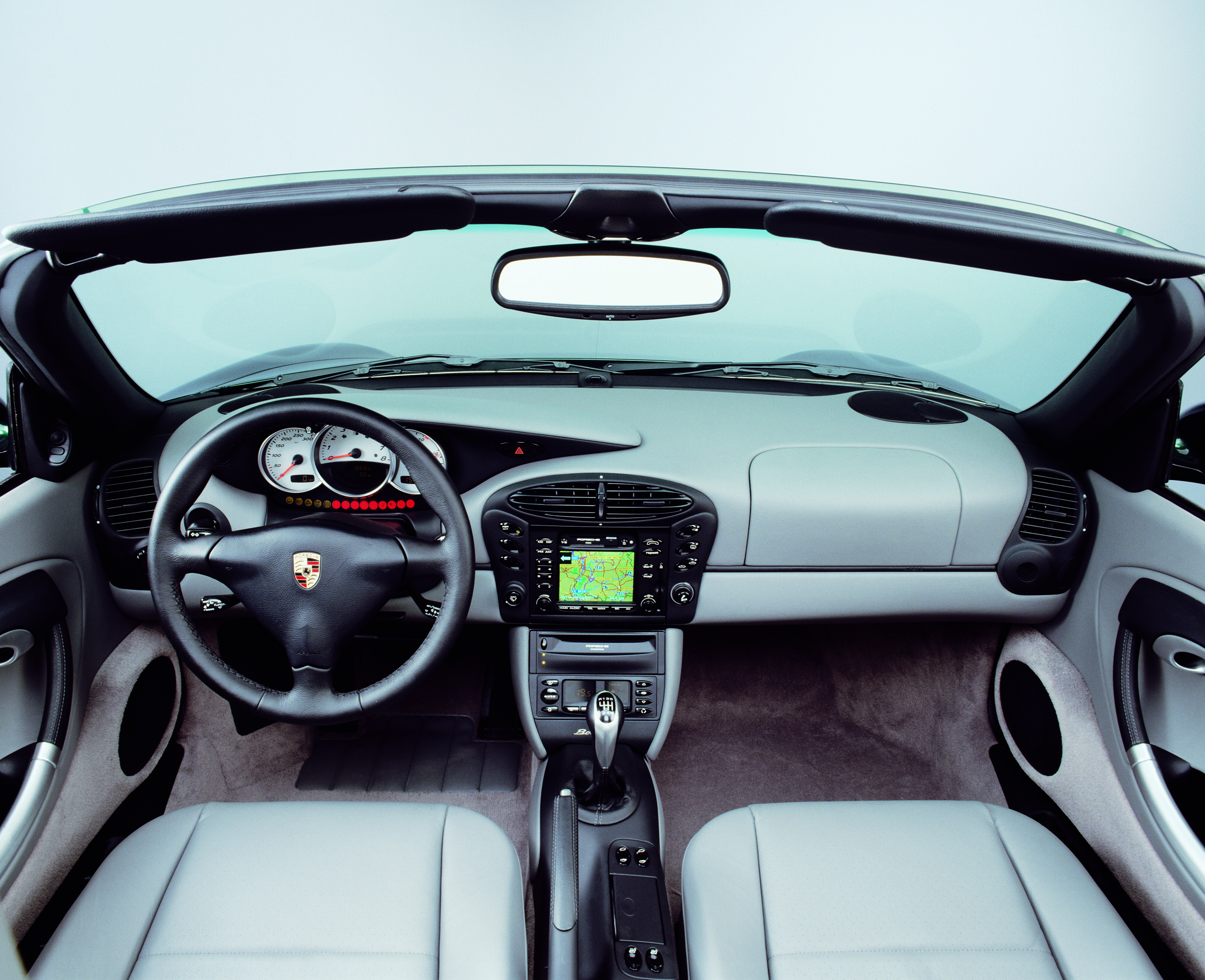 Three round instruments with silver-grey dial characterise the dashboard of the Boxster