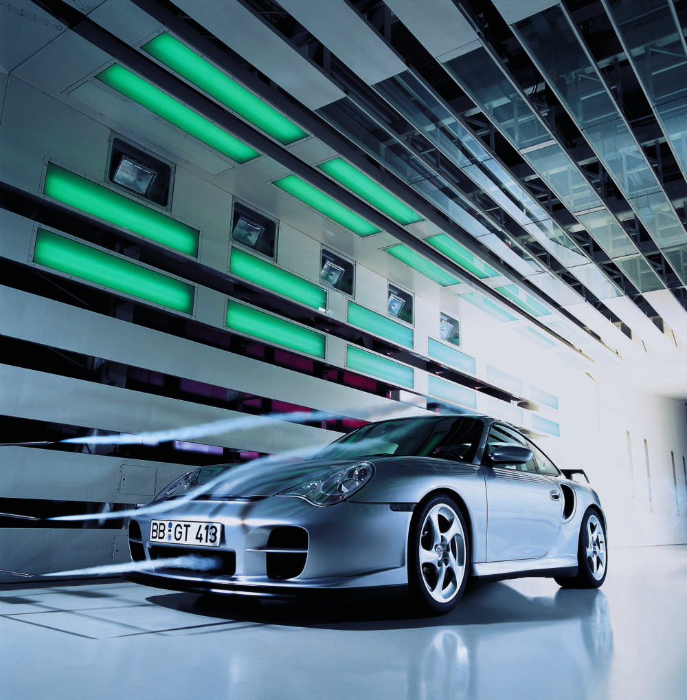Smoke fans in the wind tunnel show the direction of the air flow: the air flowing out of the middle radiator is guided through the air outlet opening in front of the luggage compartment lid not under, but over the vehicle.