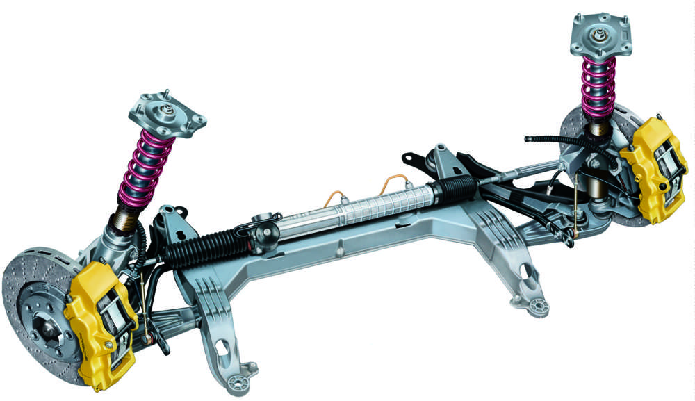 GT2 front axle with Porsche Ceramic Composite Brake (PCCB) and six-piston brake caliper