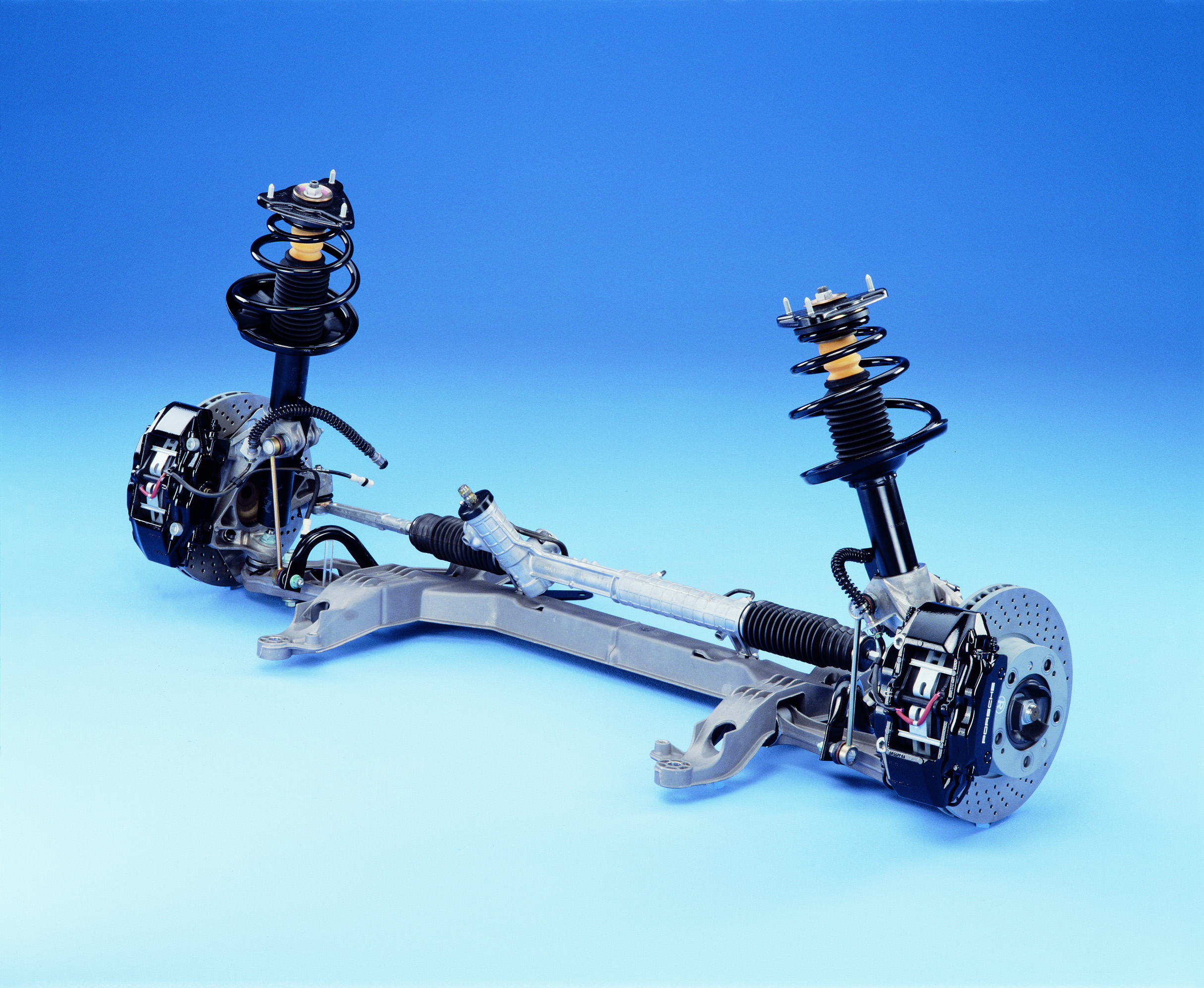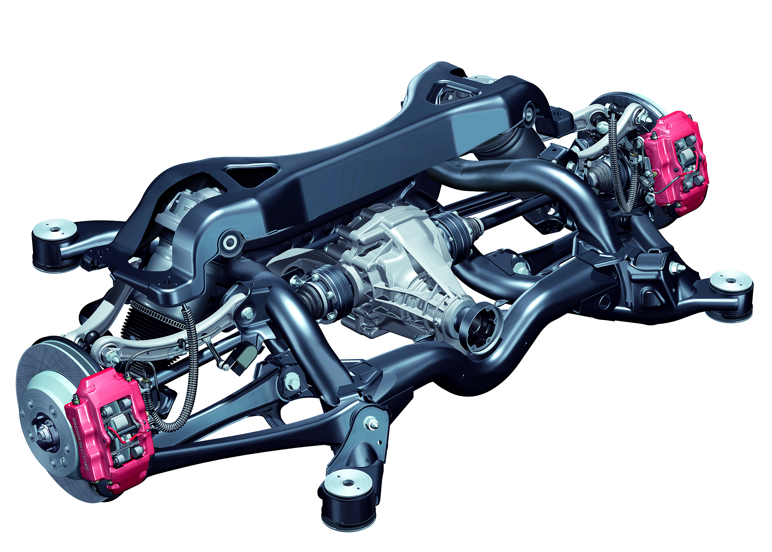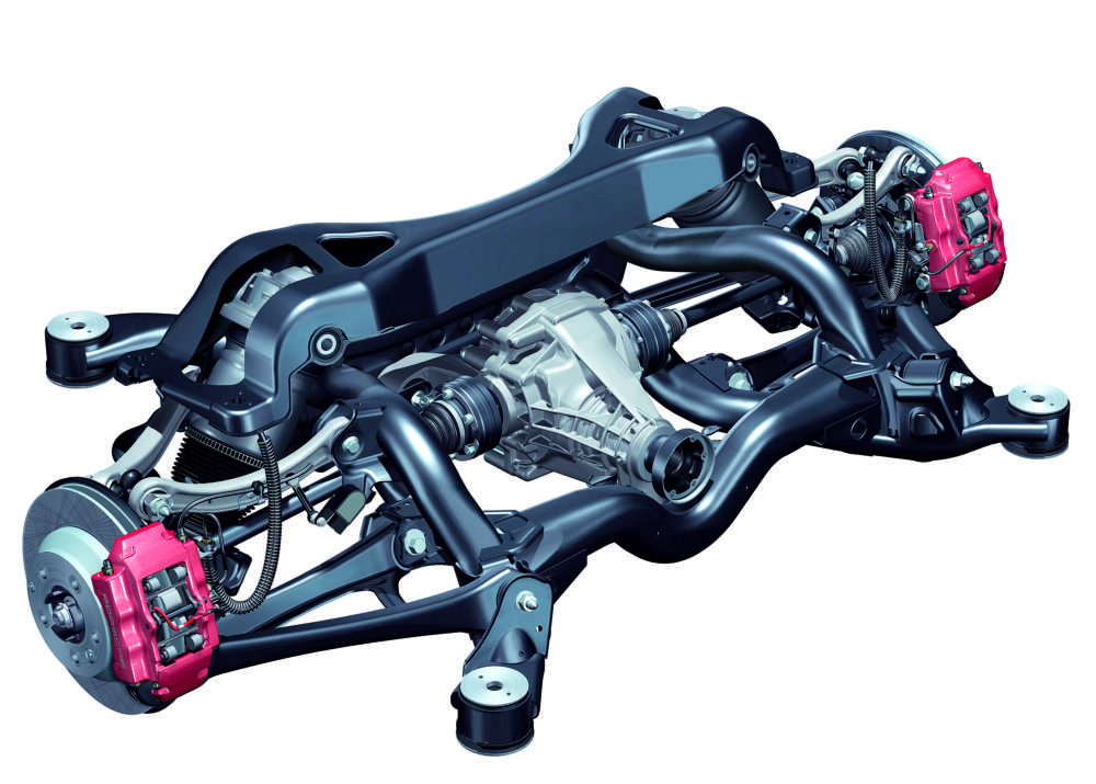 Rear axle of the Cayenne Turbo with a 17" brake system featuring internally ventilated 330 millimetre brake discs and red four-piston aluminium monobloc fixed calipers.
