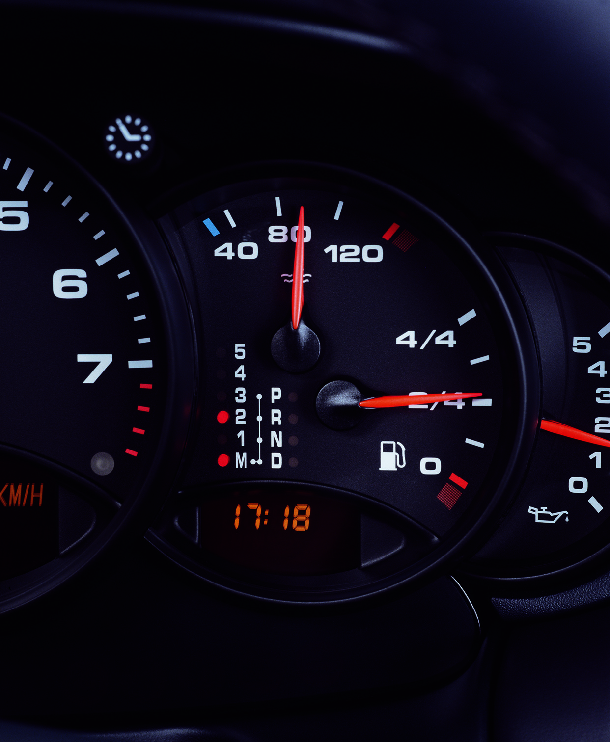 Among other things, the right-hand round instrument displays selector lever position D or M and the selected gear
