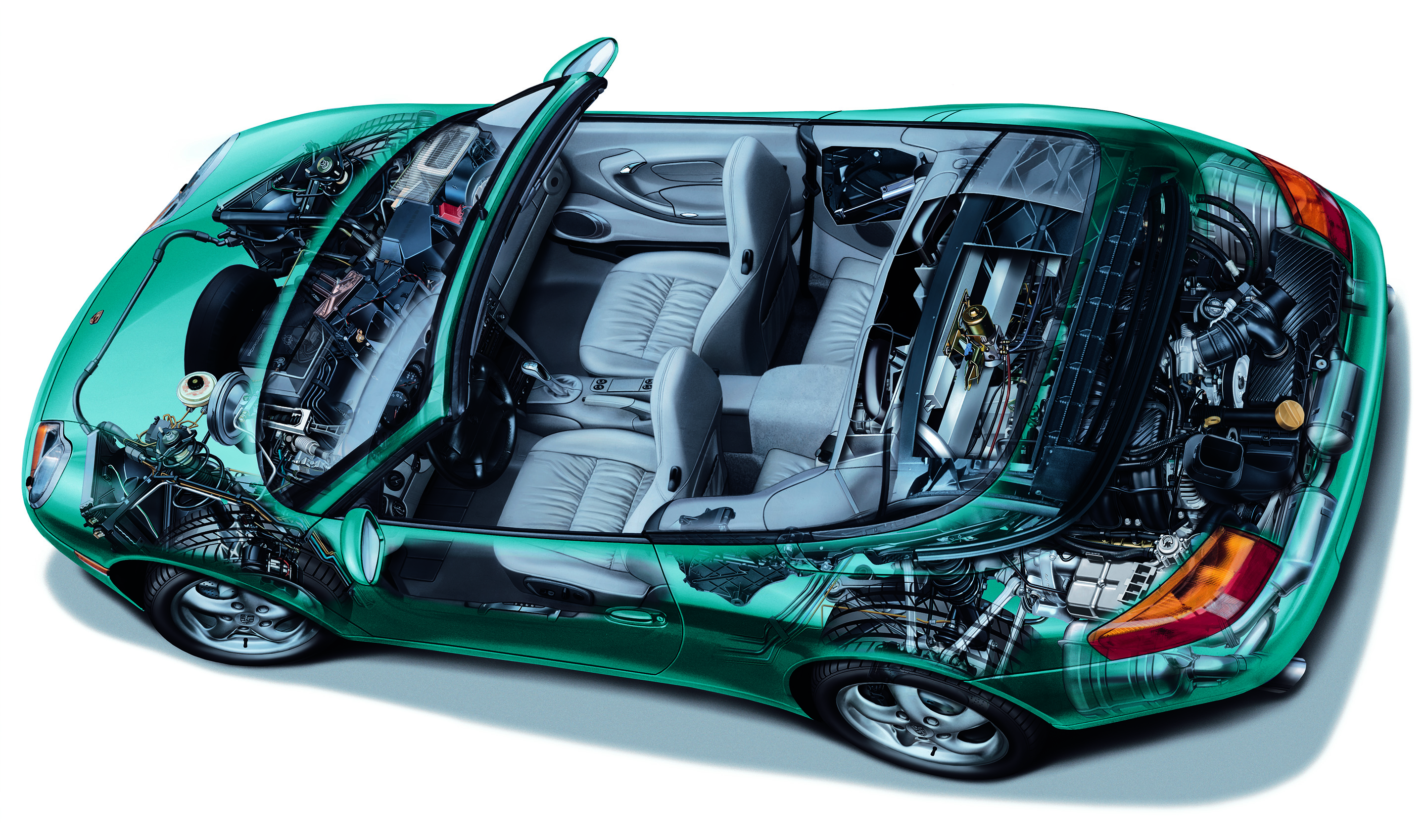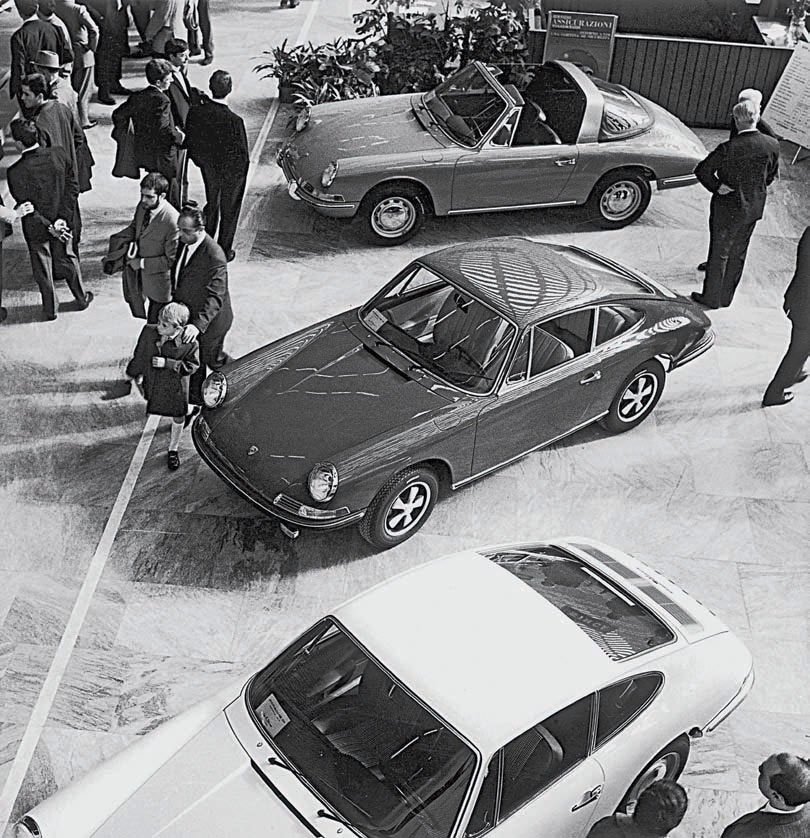 At the Turin Motor Show in November 1967, Porsche displayed a 912 Targa, a 911S coupe in the center, and a 911 coupe at the bottom of the photo. Porsche had used this largest Italian motor show for the world debut of its Cisitalia Grand Prix car in 1949. Porsche Archiv