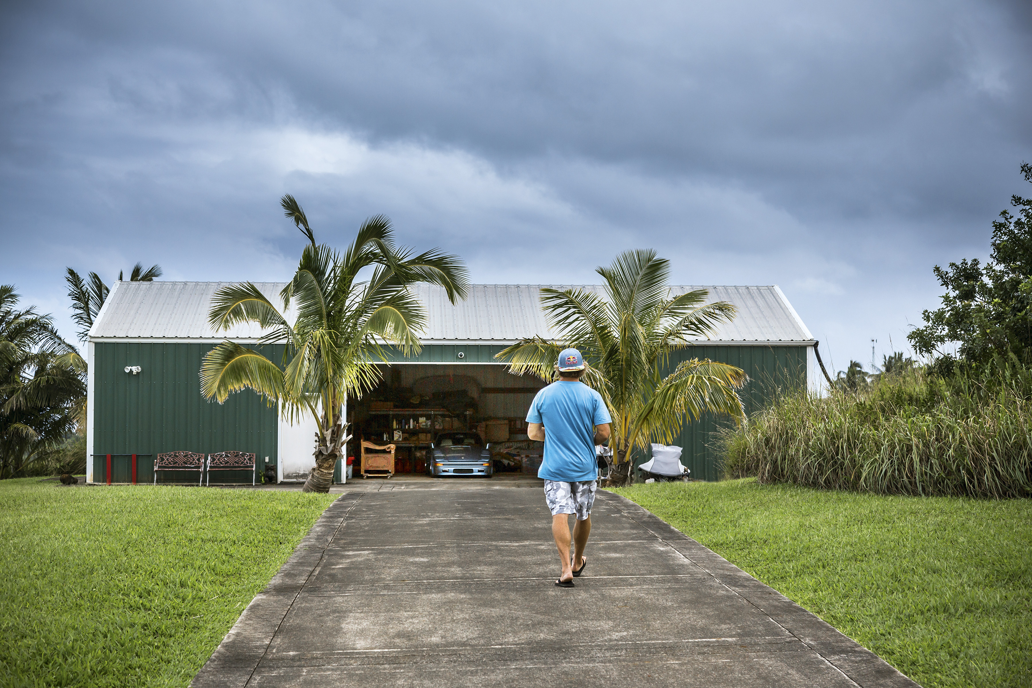 Robby Naish, windsurf legend, at his garage in Hawaii