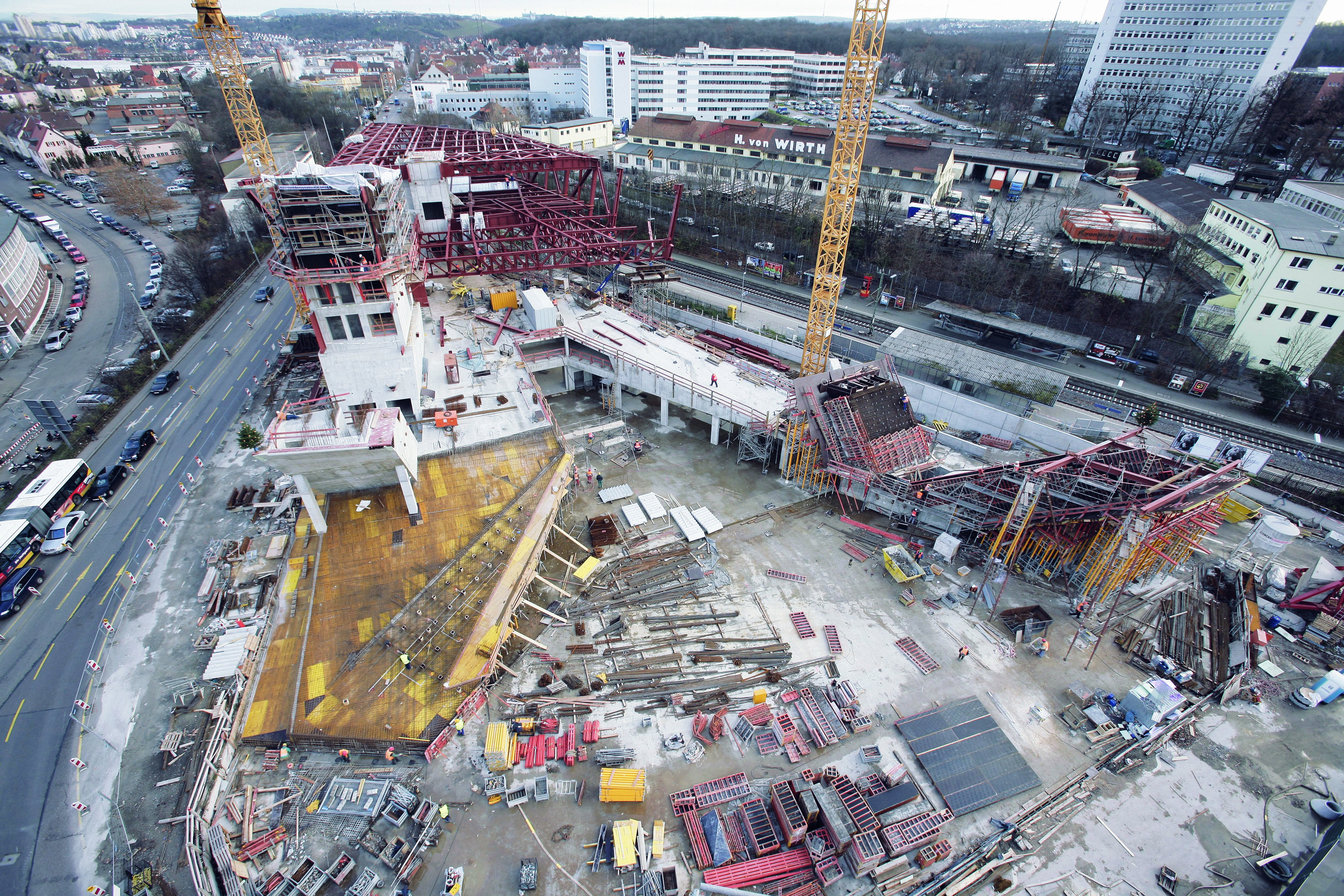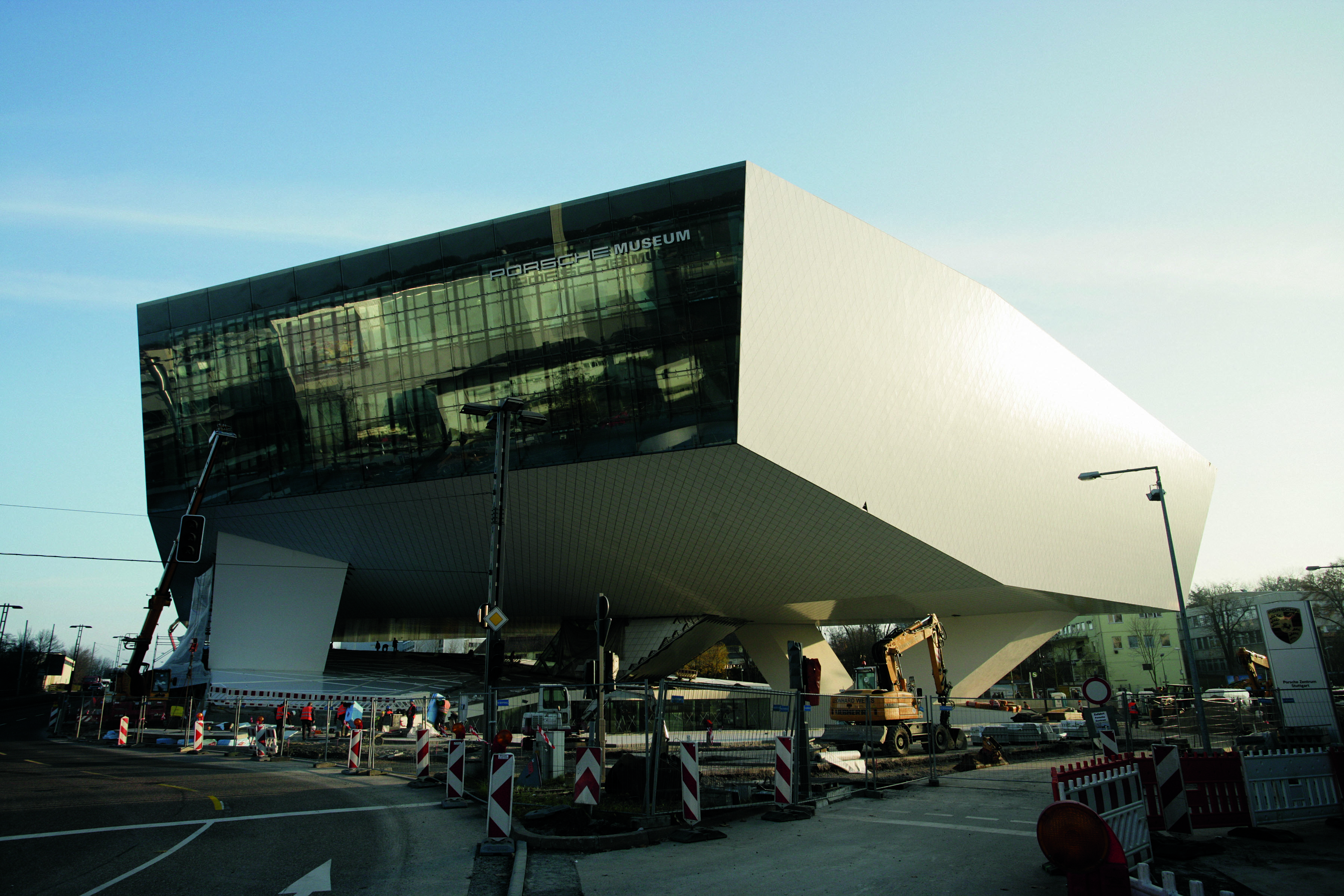 The shell of the new Porsche Museum on Porsche Platz between Schwieberdinger StraÃe (B 27, on the left) and the Neuwirtshaus suburban line station. (December 2006)
