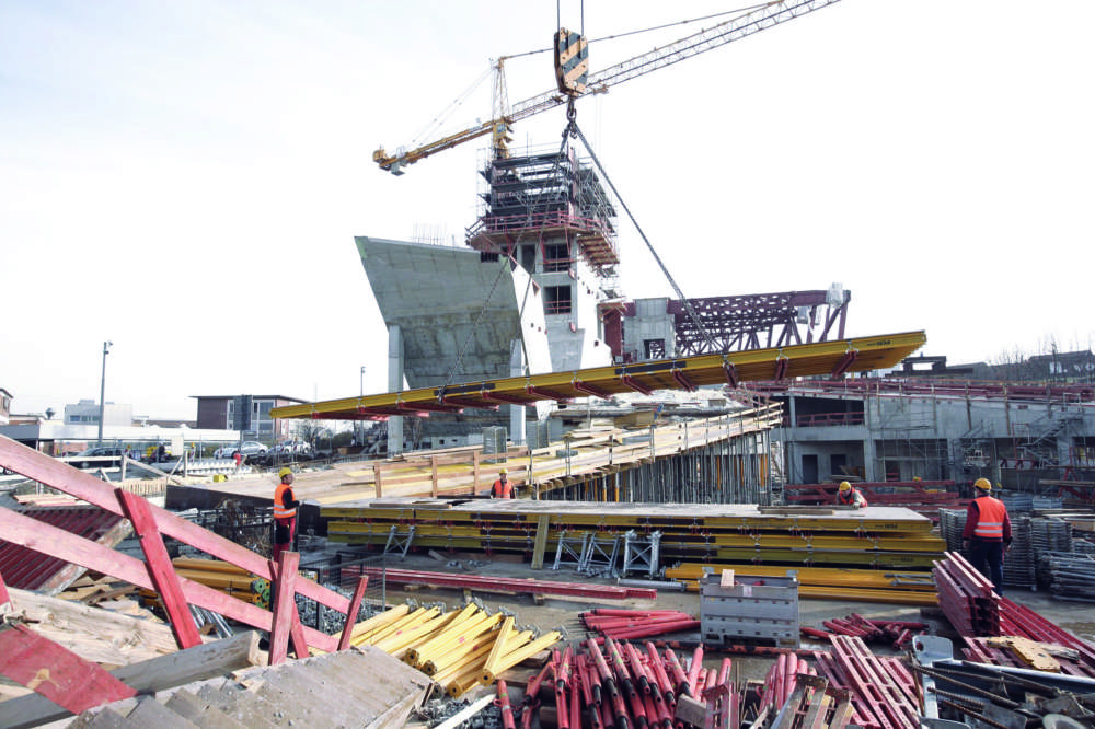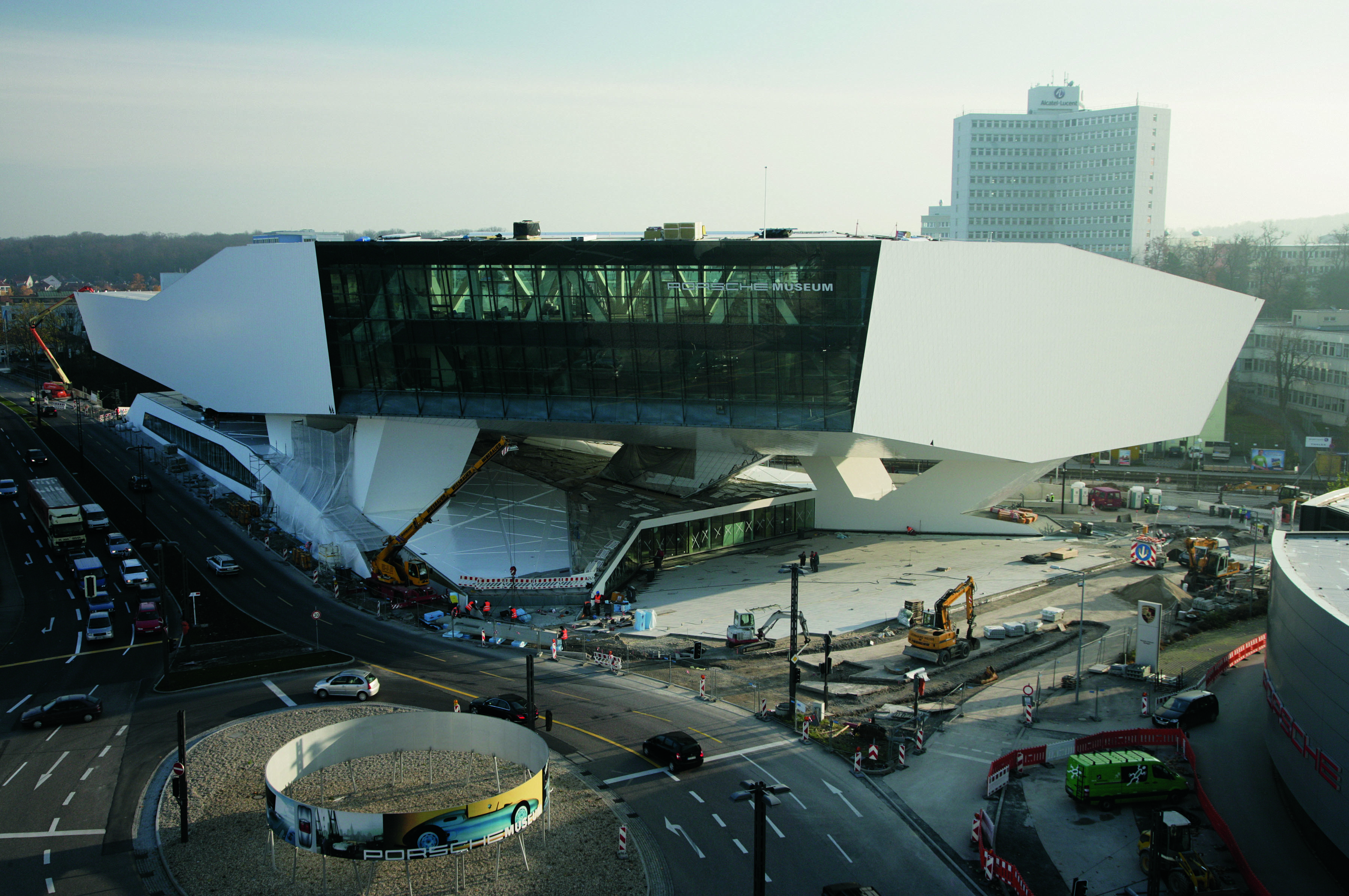 The shell of the new Porsche Museum on Porsche Platz between Schwieberdinger StraÃe (B 27, on the left) and the Neuwirtshaus suburban line station. (December 2006)