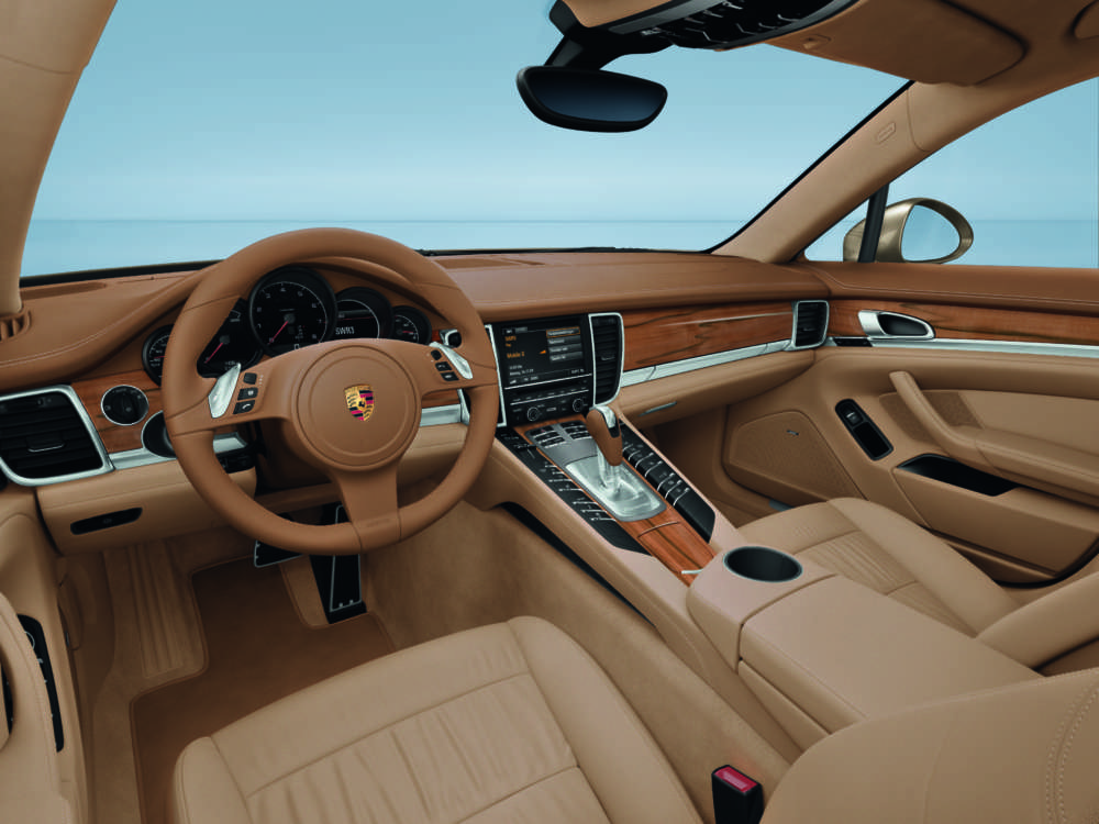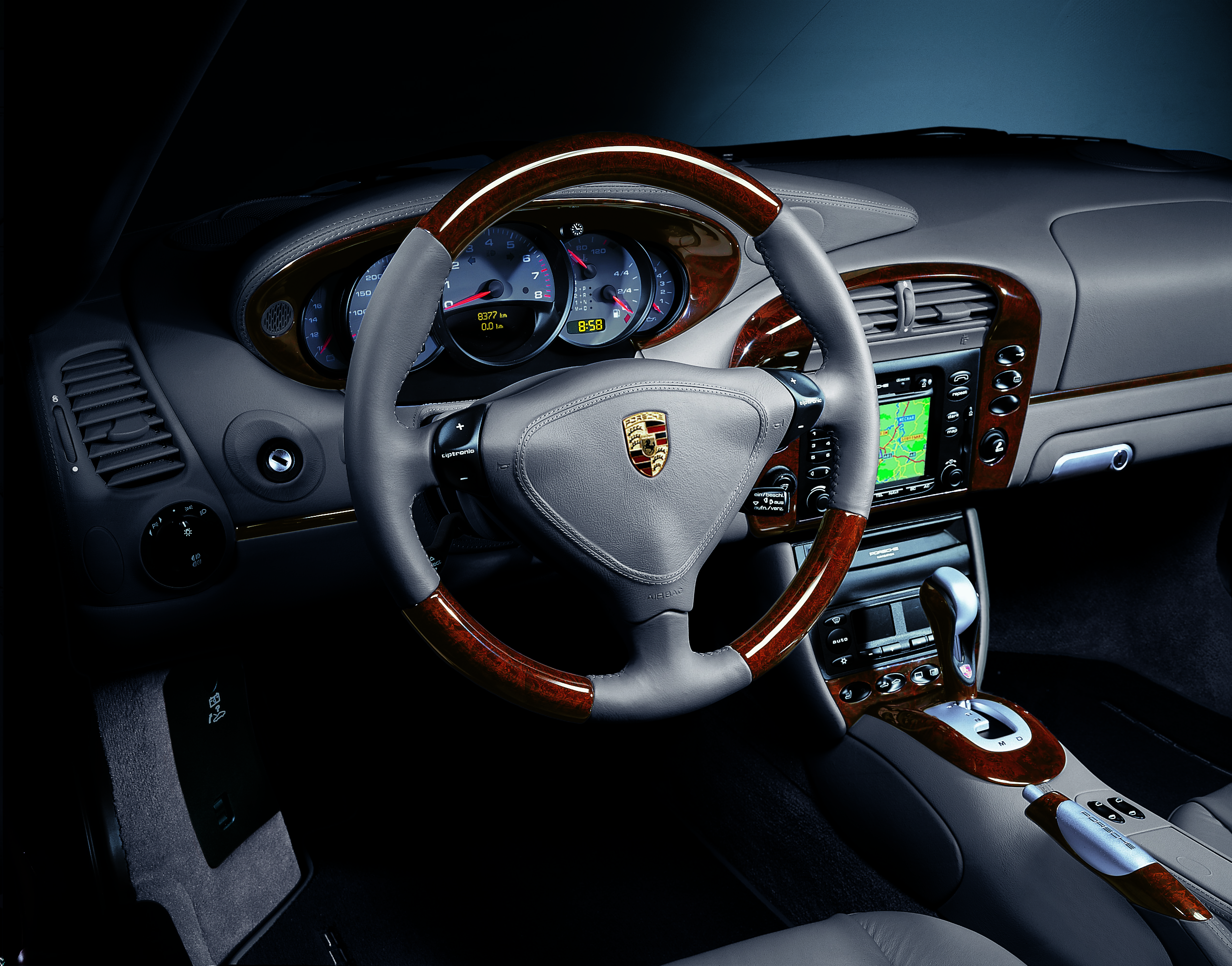 911 Targa (Exclusive program) with burr maple package dark (small), three-spoke sports steering wheel burr maple, Tiptronic selector and handbrake lever burr maple, Tiptronic gear selector gate burr maple dark, instrument dials in interior colour