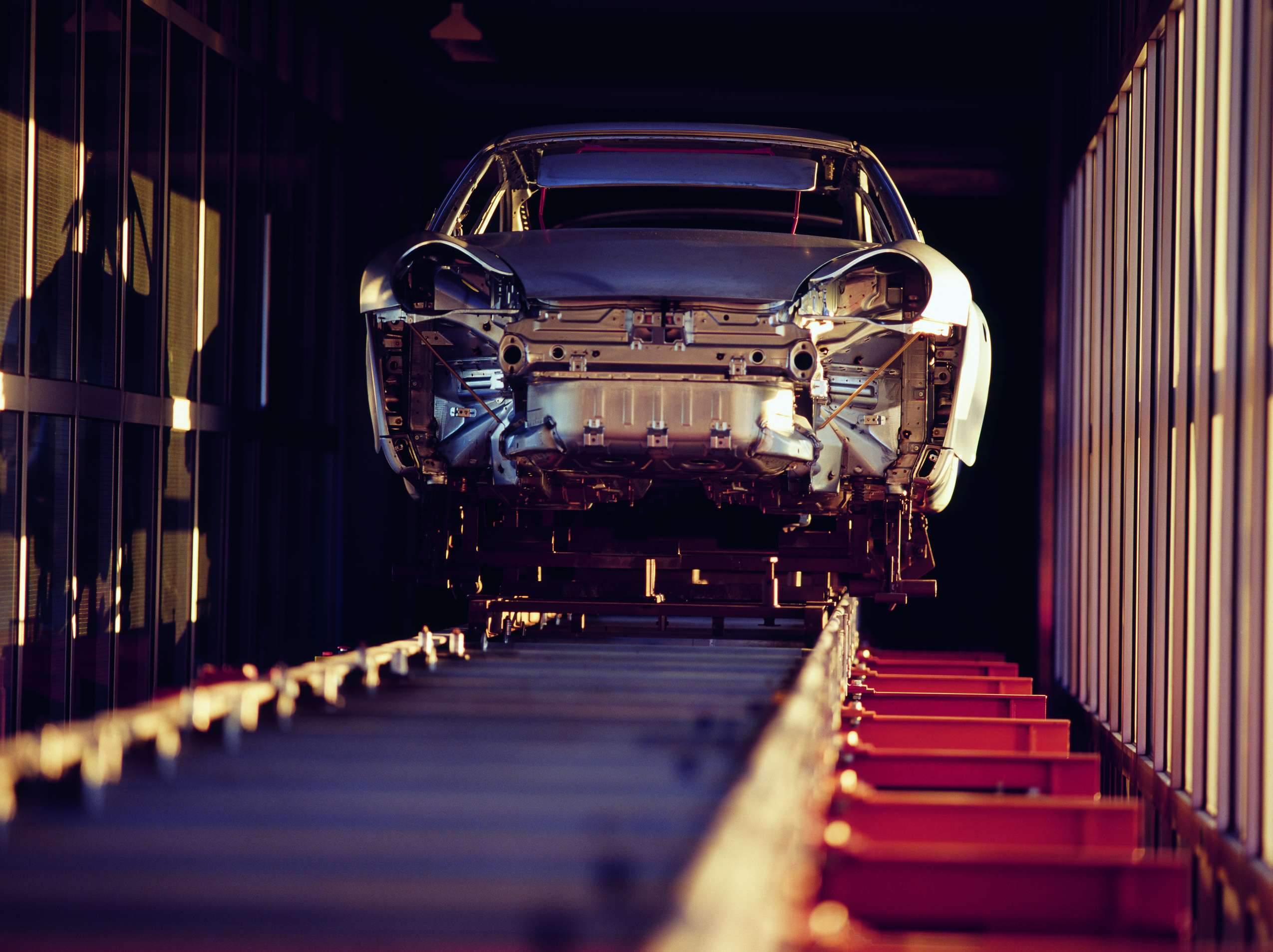 The body shells are transported from the body construction area to the paintshop via a conveyor-belt bridge