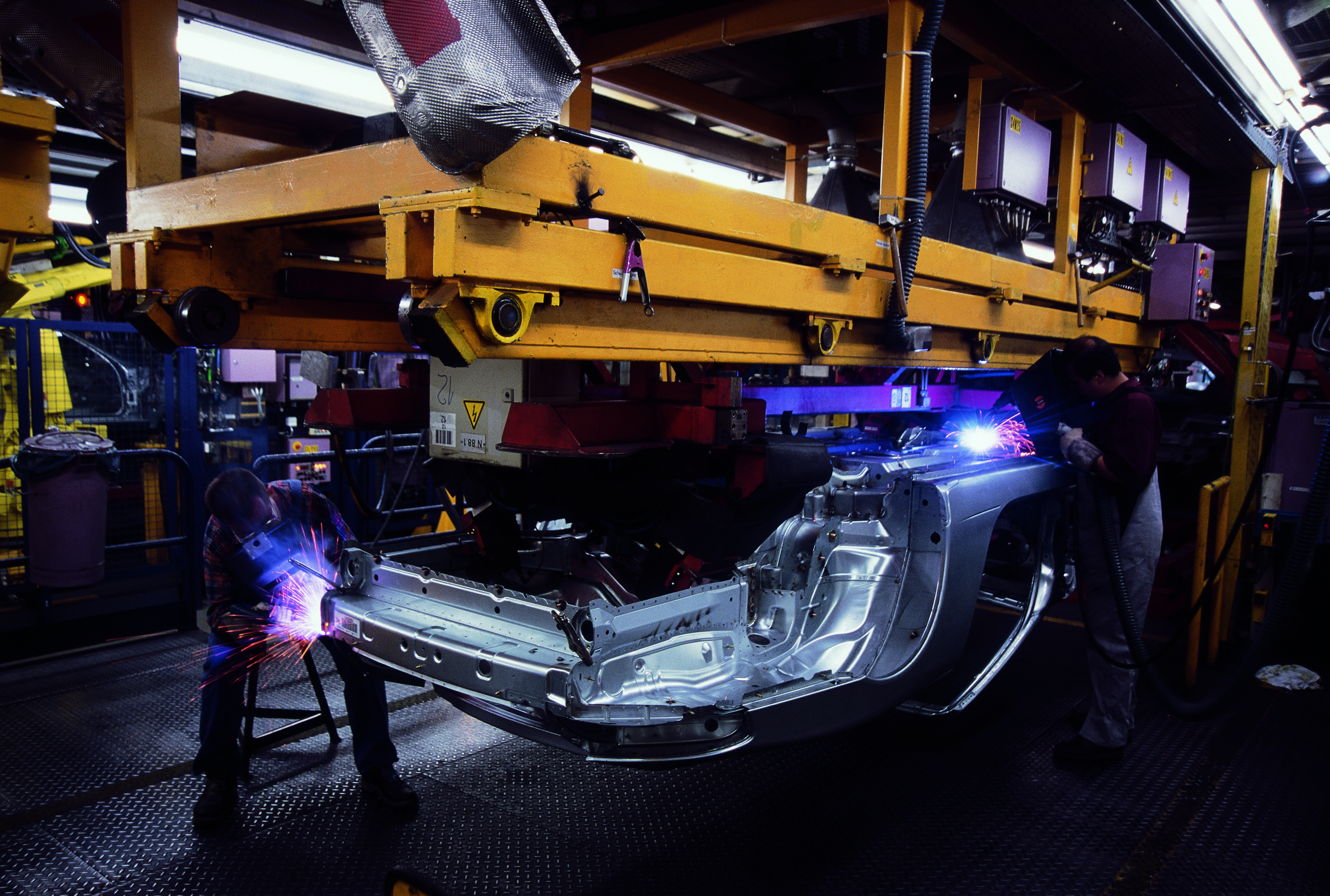 A robot welds fastening elements (bolts) required e.g. for wiring harnesses