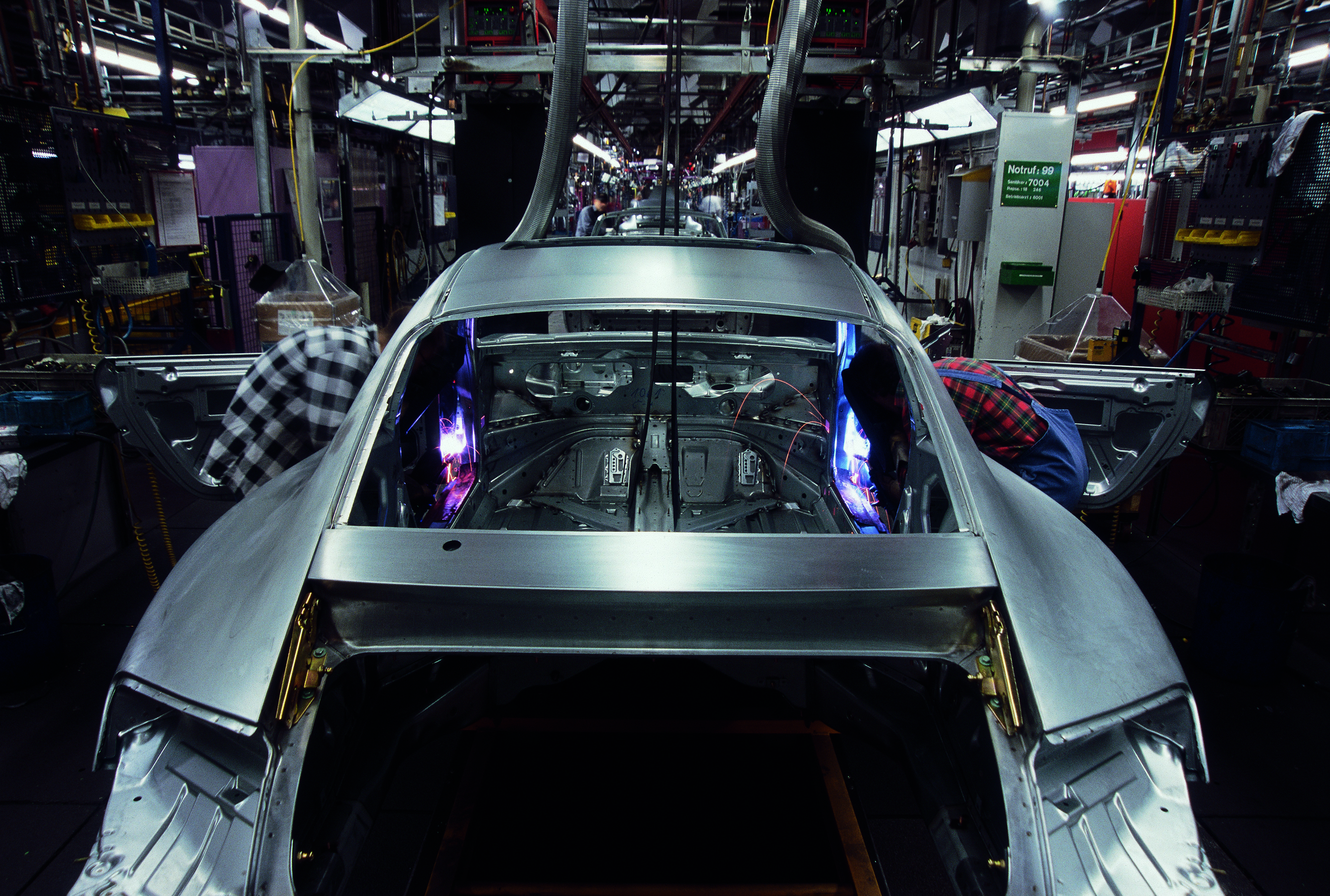 The construction of the new Porsche museum: the steel construction for the future exhibition area (5,600 m2) floats above the second floor. (January 2007)