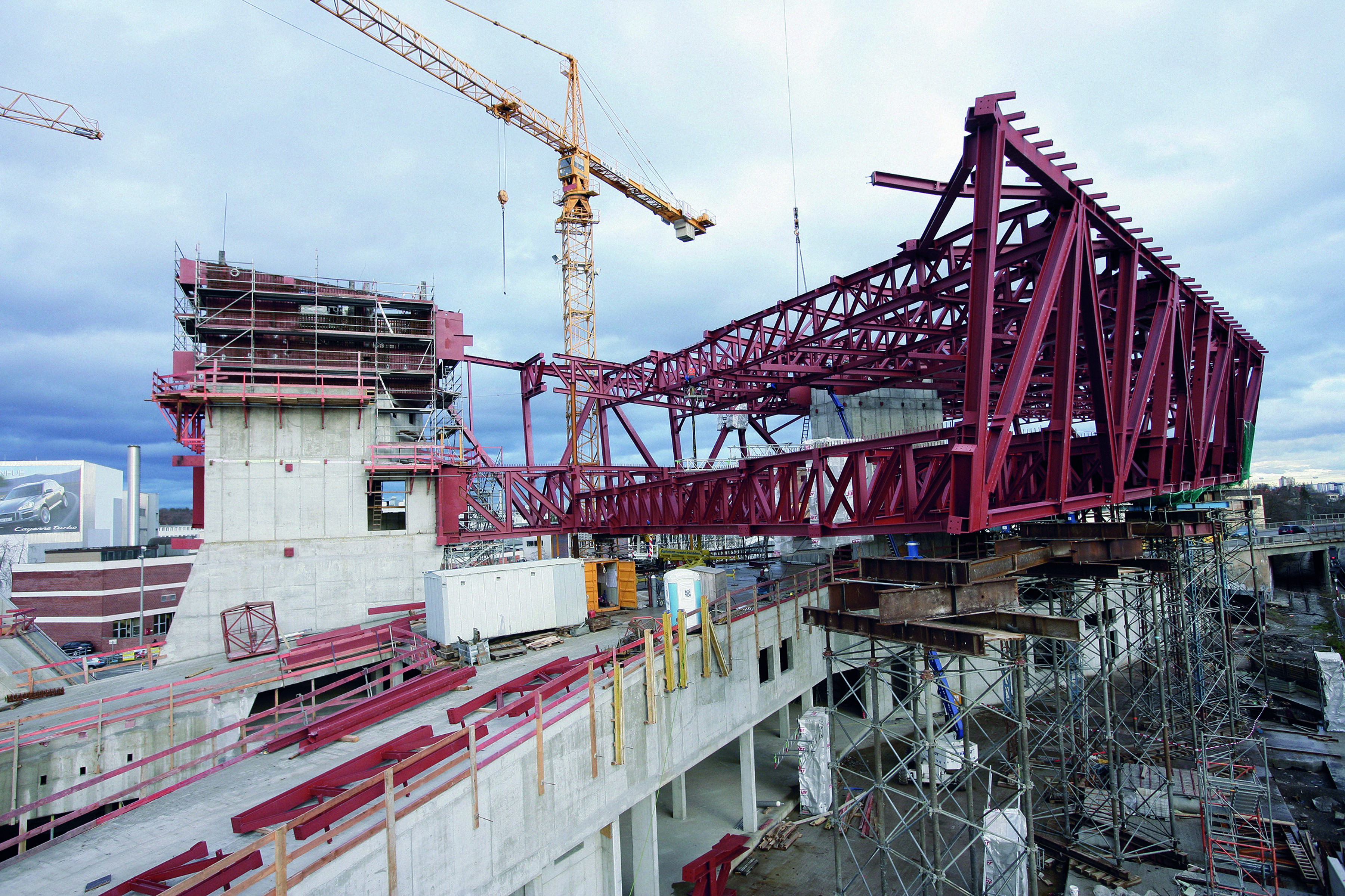 The construction of the new Porsche museum: the steel construction for the future exhibition area (5,600 m2) floats above the second floor. (January 2007)