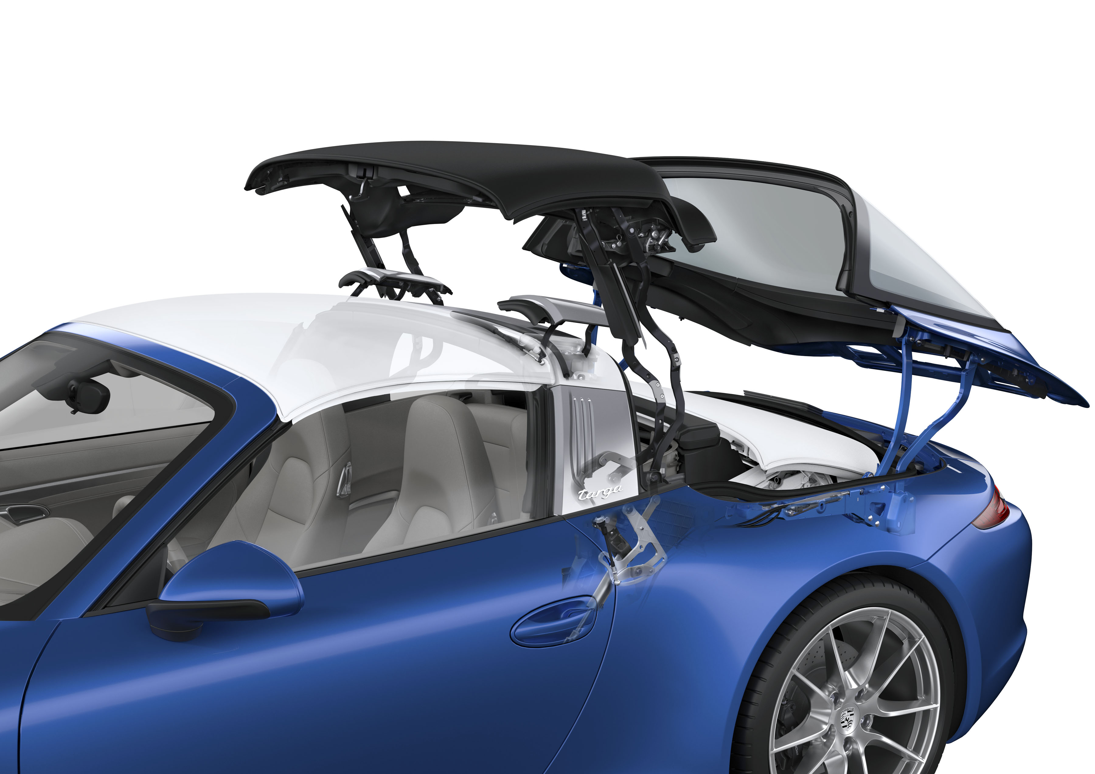 911 Targa: The roof system consists of two moving parts, a soft top anda glass rear window.