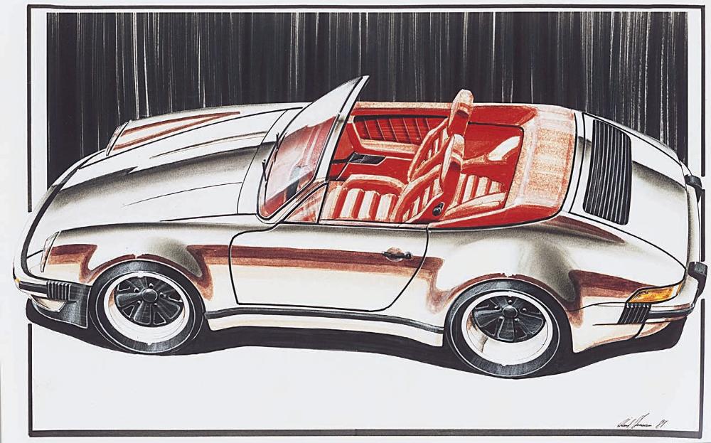 Porsche stylist Roland Stemmann began working on 911 cabriolet concepts soon after Peter Schutz and Helmuth Bott launched the project. This combination of white body with red interior carried through to at least one celebrity owner. Porsche Archiv