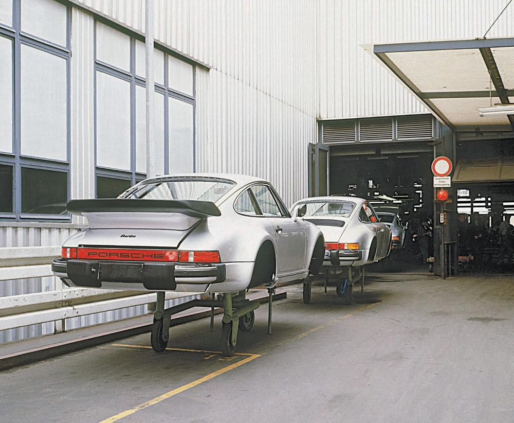 Perhaps this was an early form of just-in-time delivery as painted 930 Turbo bodies waited outside the factory. These cars were queued up for engine-and chassis marriage and for interior completion. Porsche Archiv