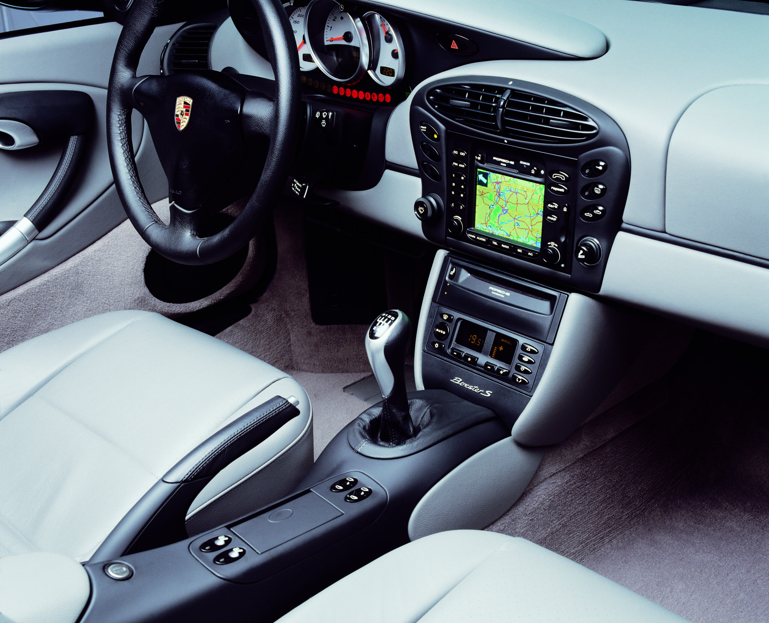 Interior equipment of the Boxster with Porsche Communication Management (PCM) and gearshift for the standard six-speed manual transmission
