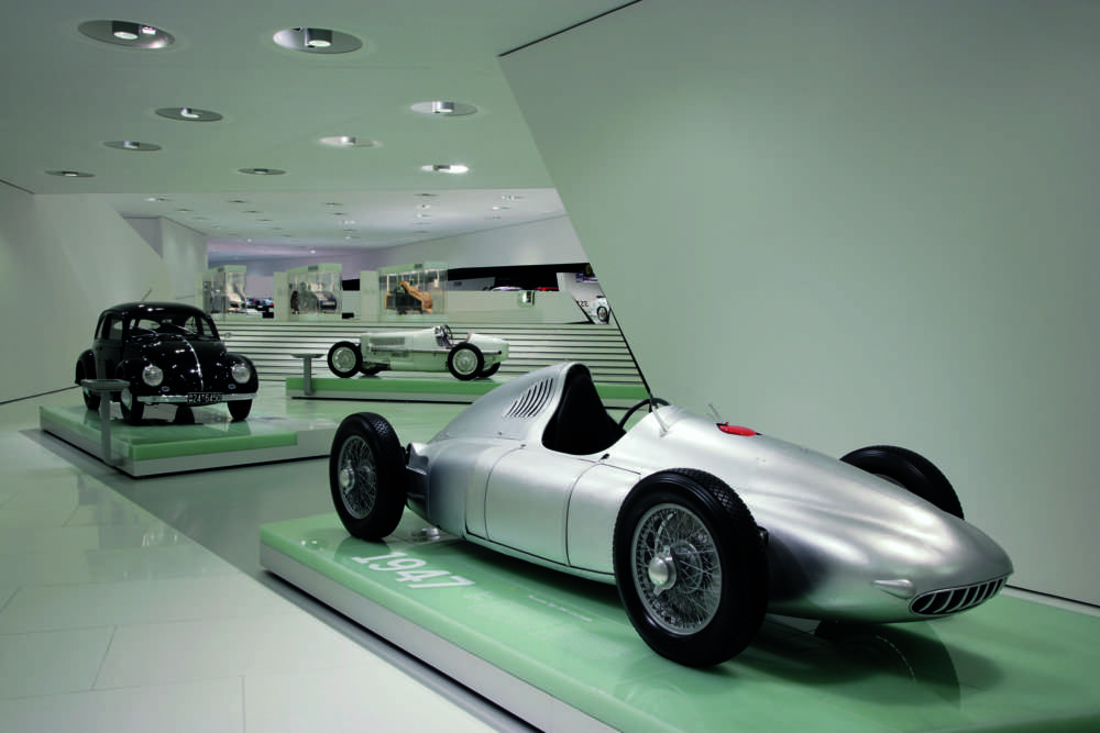 The exhibition: the Prologue with Type 360 Cisitalia, 1947 (in front) and VW Beetle, 1950 (behind)